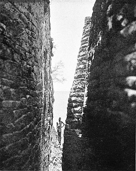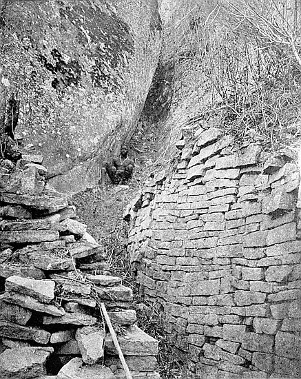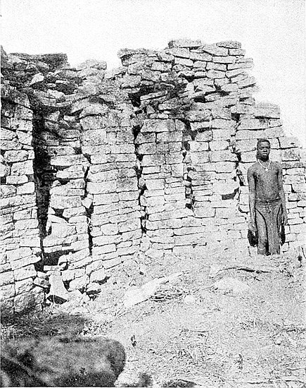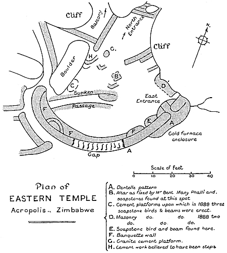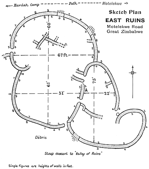 (a) The west wall is considered by all practical builders and architects to be far slighter, much inferior in construction, fuller of defects, and to contain to a greater extent ill-shaped stones than the main wall on the east side, while the foundations are at many points far more irregular, and the batter-back of the interior face of the west wall is less severe than is the case of the east side. Lengths of 25 ft. each of both walls have been examined and compared and photographed, and the number of defects of construction recorded. The number of false and “straight joints,” false and disappearing courses, and stones supported at their corners by granite chips, which the west wall contains, is roughly about forty odd to every one of such defects in the east wall, which is the architectural marvel for symmetry, grand proportion, true courses of most carefully selected and assorted blocks (somexxv of which have been dressed with metal tools) of any other ancient architectural features at Zimbabwe. All this is an ocular demonstration, and is commented upon by the most casual visitor to these ruins. This, too, is very patent when seen from the summit of Zimbabwe Hill, the view looking down upon the temple revealing most obviously the different characters of the walls.