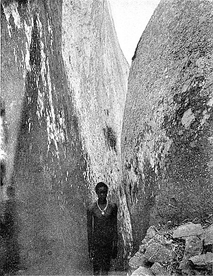 The secluded valleys, and also the caves in hills, for a distance of six miles, and in some cases as far as ten miles, from Zimbabwe have been systematically searched in the hope of discovering the burial place of the old gold-seekers. The neighbourhood of Zimbabwe contains several extensive ranges of granite hills each enclosing many secluded and Sinbad-like valleys and gorges, where natives state white men had never previously entered. Such spots on the whole of the Beroma Hills to the east of Zimbabwe, the south end of the Livouri Range to the west, the Bentberg Range to the south, and several hills in the Nini district, as well as several parts in the Motelekwe Valley, have been systematically searched without avail, though there are in certain of these secluded places traces of walls and artificially placed upright stones and other signs of human presence which require some explanation. The siltation of soil from the steep hillsides of many of these most romantically situated valleys has been very extensive. These searches could only be carried on after veld fires had swept the district of the rank grass which here grows to a height of 12 ft. Mr. Bent and other writers have shown that the old Arabians religiously preserved their dead, burying them in secluded spots at some considerable distance from any place of occupation. The writer is not without hope that these burial-places may yet be found. The population of Zimbabwe at several different periods must have been immense, and, judging by the remains found near some of the oldest types of ruins in other parts of the country where the amount of gold ornaments buried with each corpse ranged from 1 oz. to 72 oz., the discovery of such places in the Zimbabwe district would yield importantxviii results, especially as, for many reasons, Zimbabwe undoubtedly appears to have been the ancient metropolitan capital and the centre of gold-manufacturing industry of the original and later Arab gold miners, and the place so far has yielded the richest discoveries of gold in every form.