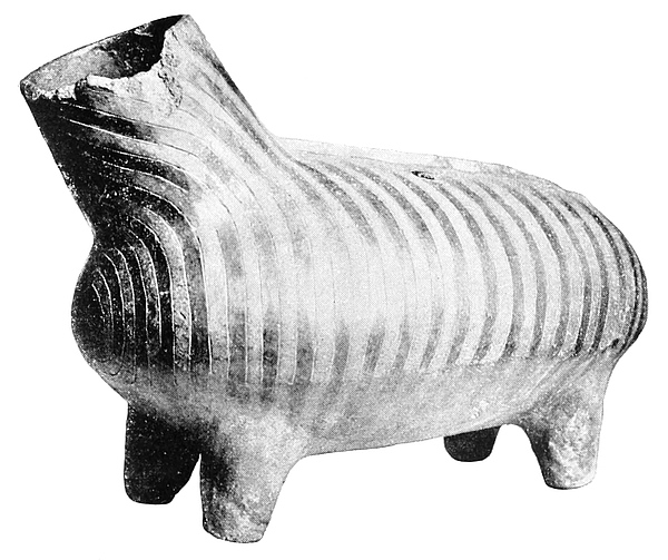 At a still lower depth in No. 6 Enclosure a quantity of granite clay crucibles, showing gold richly, were met with, and these are undoubtedly of older type than the native pottery scorifiers, also some ingot moulds of soapstone of the double claw-hammer or St. Andrew’s cross pattern.