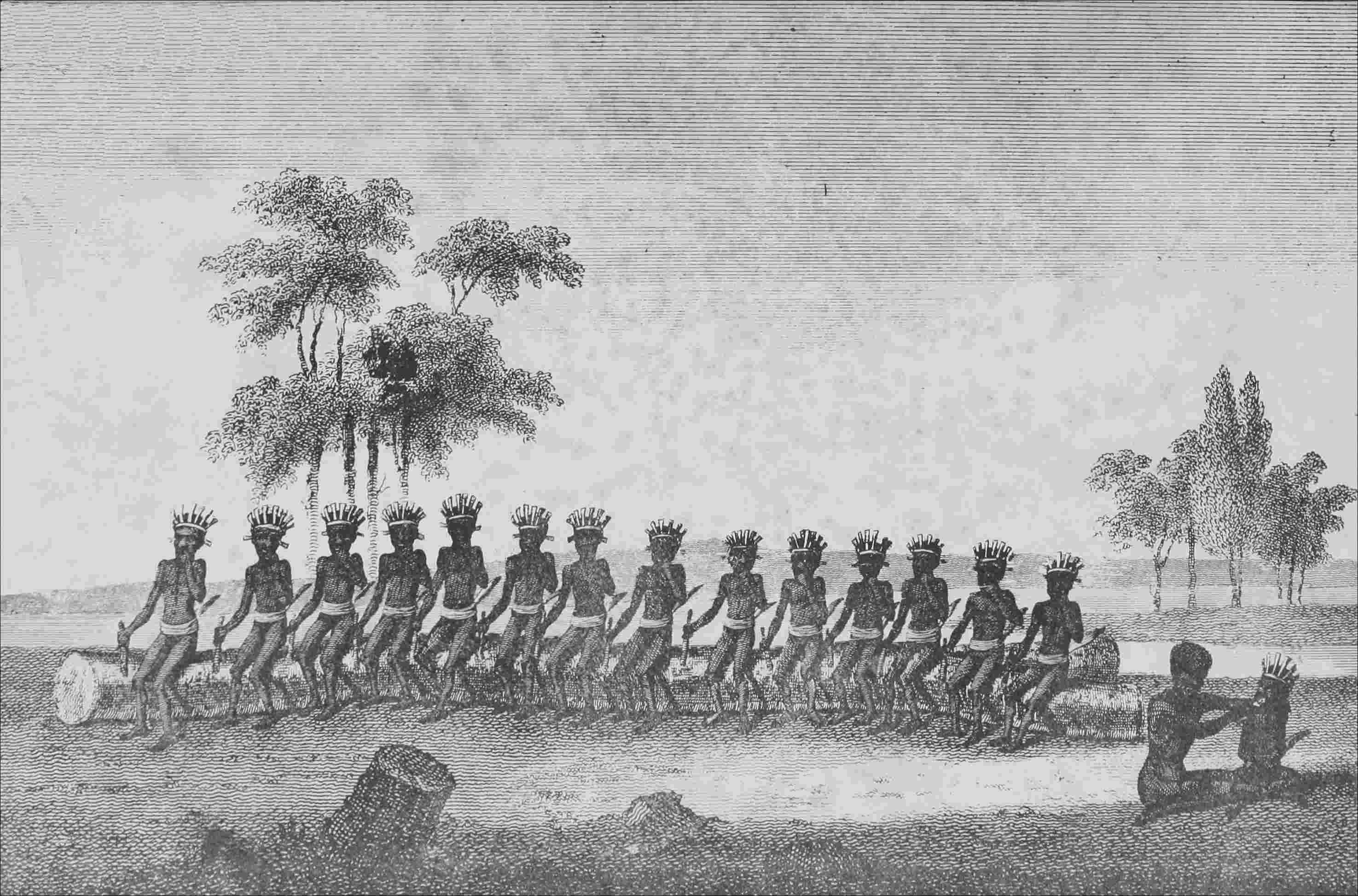 The most singular tribe Mitchell met with was what he termed the spitting tribe. These savages waived boughs violently over their heads, spat at the travellers, and threw dust with their toes, and forming into a circle, shouting, jumping, spitting, and throwing up dust, sang war songs with the most hideous gestures; their faces seemed all eyes and teeth.