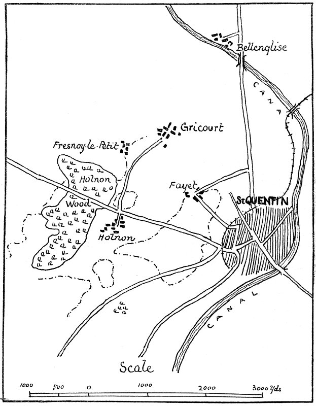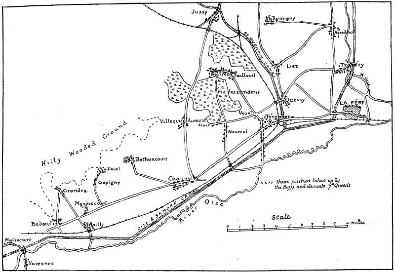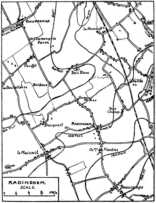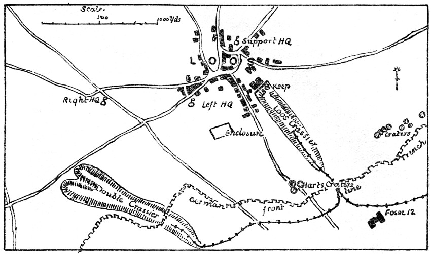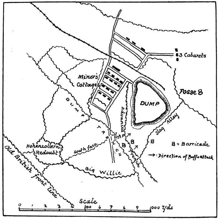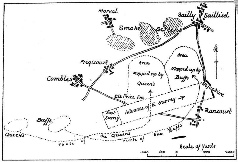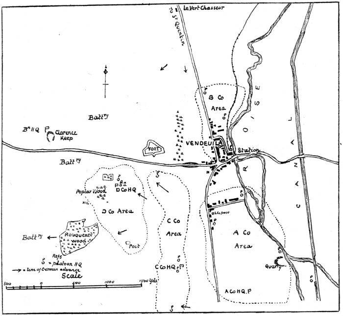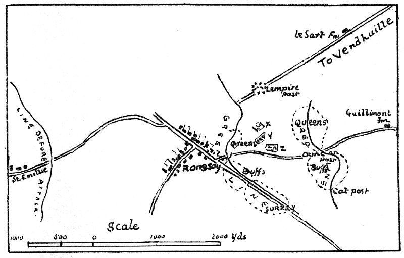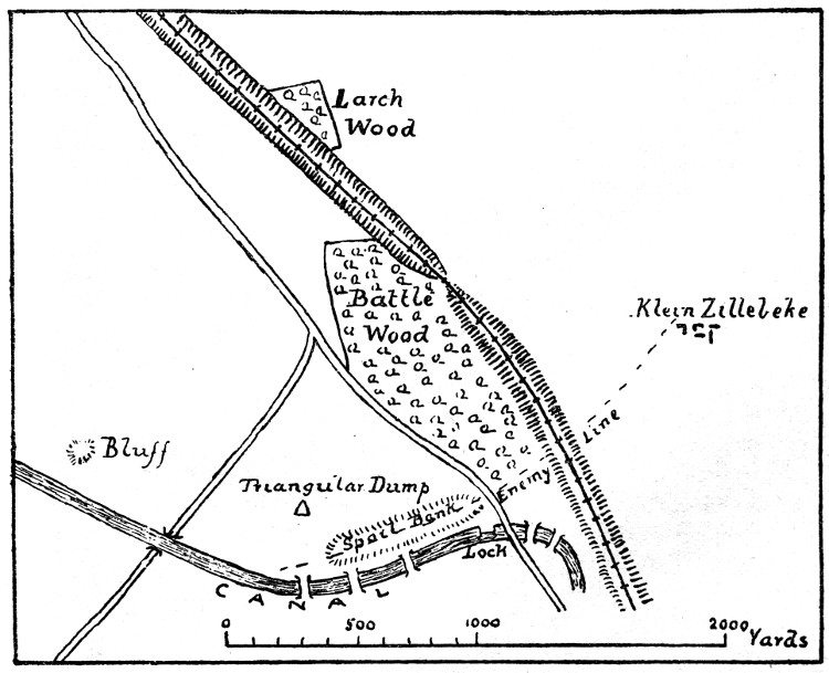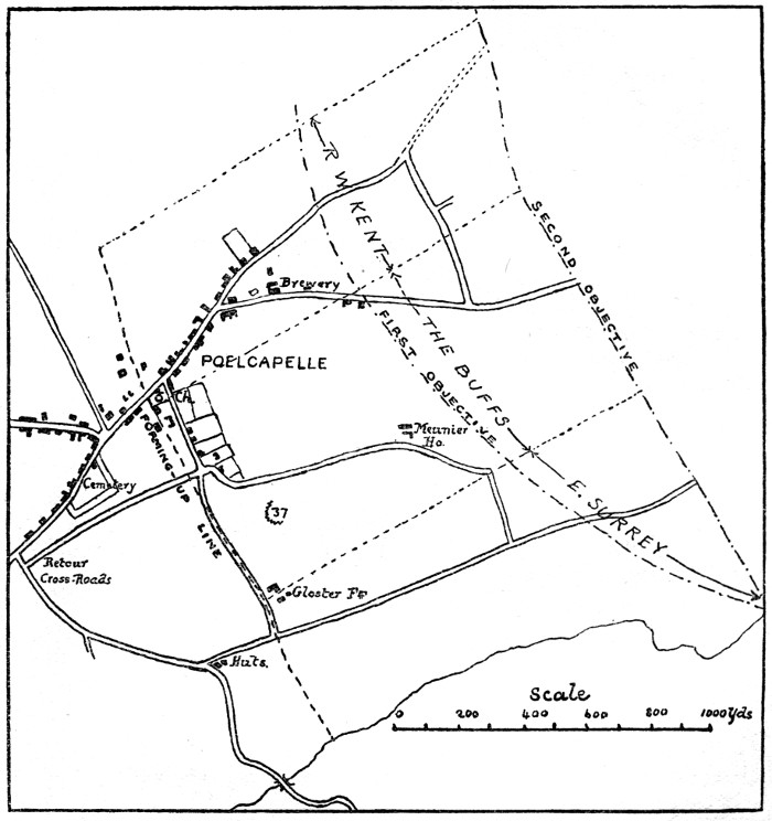 [8] This half-company, under Major R. E. Power, had not rejoined the battalion the previous night, having been detailed to occupy an unfinished trench in the front line. Lieut. J. W. Butts Archer was killed whilst superintending a working party.
