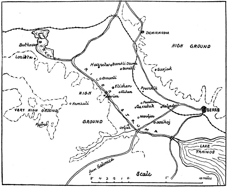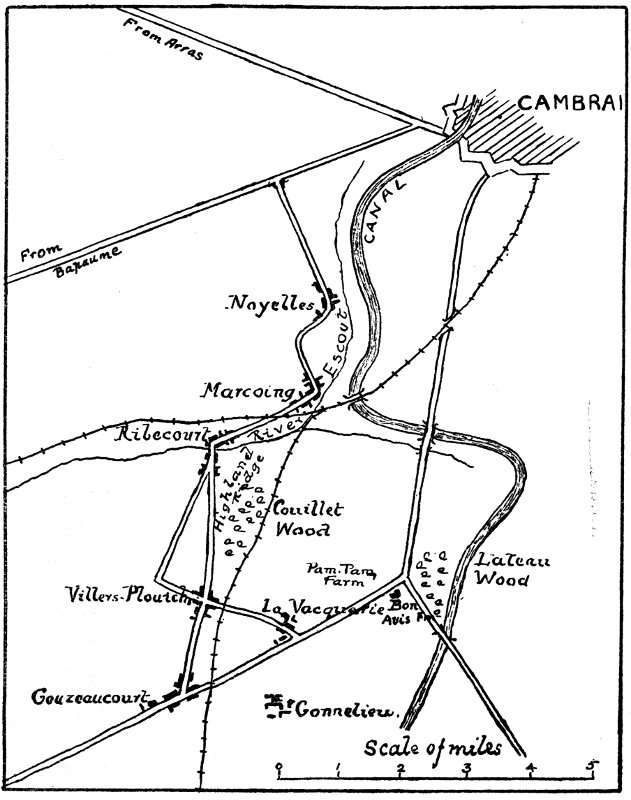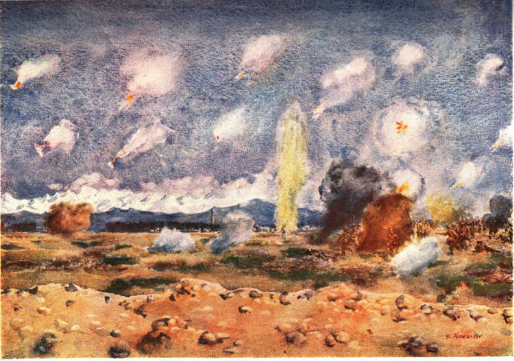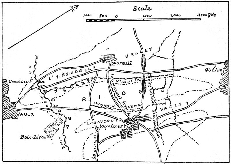 [29] This was the first practical illustration of the German method of infiltration which had lately been introduced and which now influences our own tactics. Blobs of Germans with light guns could be seen advancing wherever they could make progress—wherever they saw a “soft spot.”