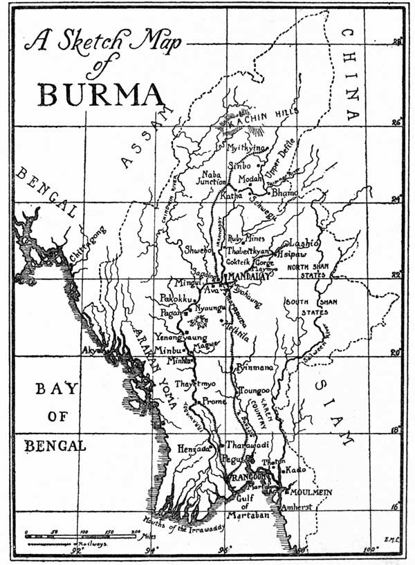 This may seem surprising when it is remembered that Burma now forms part of our Indian Empire, and has for many years carried on a large trade with England. We may perhaps better understand this if we turn to our atlas and see how the country is situated. As you will see, Burma lies on the eastern side of the Bay of Bengal, just north of the Malay Peninsula, joining Siam and China on the one side and the Indian provinces of Assam and Manipur on the other, while from an unknown source in the heart of Thibet its great river, the Irrawaddy, flows throughout the entire length of the country, and through Rangoon, the seaport at its mouth, forming the great highway for commerce and communication between the world at large and its little-known interior.