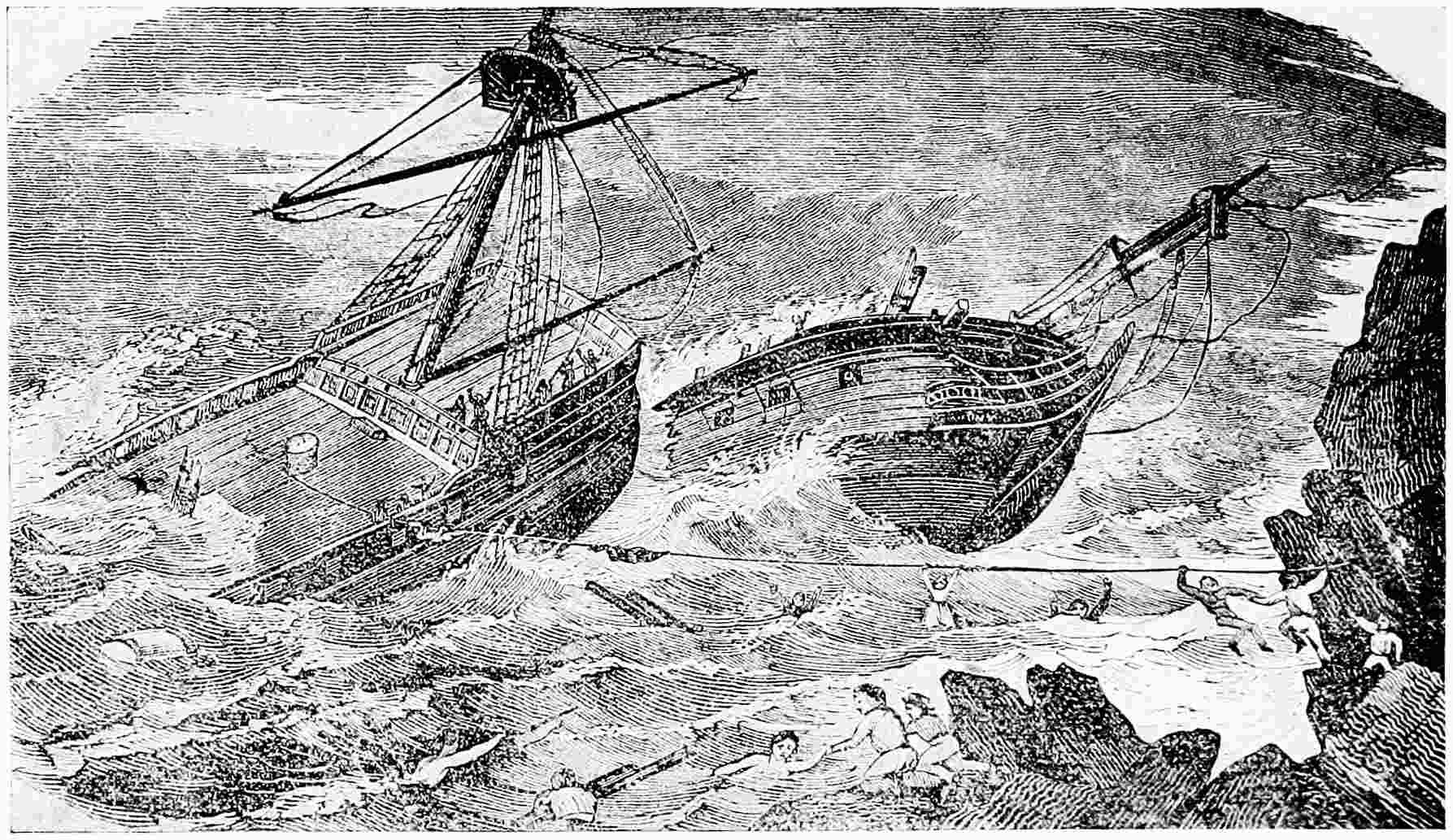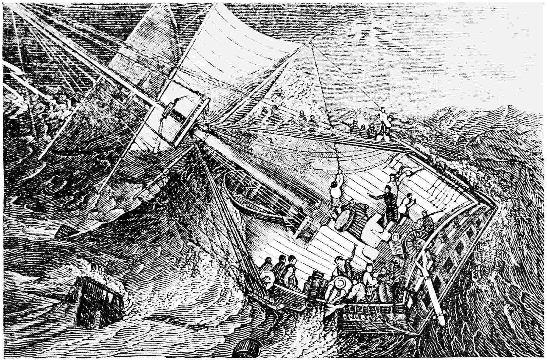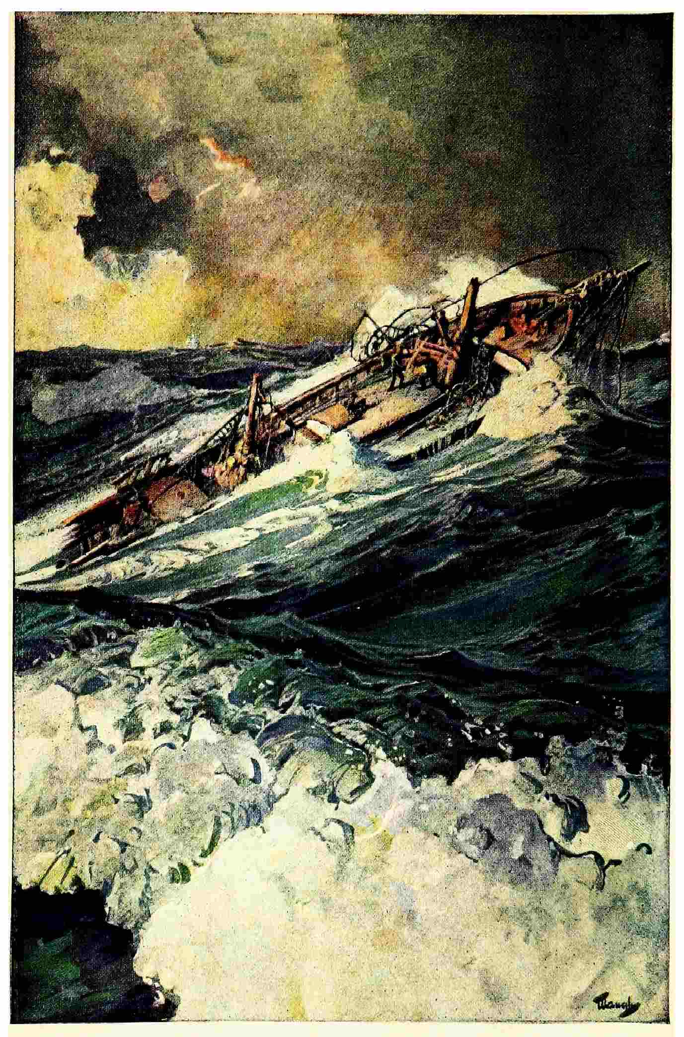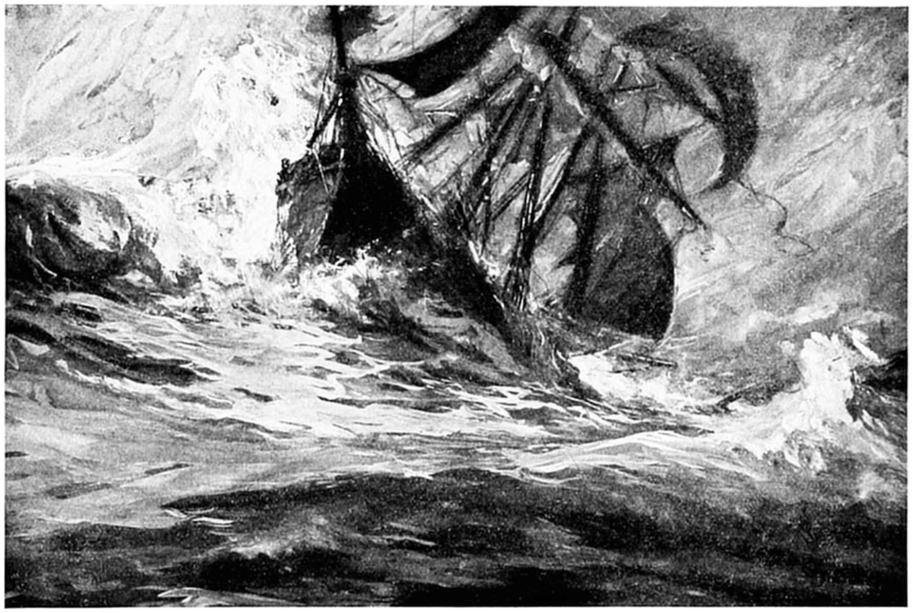 Worse was to befall her. At midnight she was capsized, or thrown on her beam-ends, as the sailor’s lingo has it. She lay on her side while the clamorous seas washed clean over her. The skipper, the mate, the four seamen, and the cook somehow clung to the rigging and grimly refused to be drowned. They were of the old breed, “every hair a rope-yarn10 and every finger a fish-hook.” They even managed to find an ax and grope their way to the shrouds in the faint hope that the brig might right if the masts went overside. They hacked away, and came up to breathe now and then, until foremast and mainmast fell with a crash, and the wreck rolled level. Then they slashed with their knives at the tangle of spars and ropes until they drifted clear. As the waves rush across a half-tide rock, so they broke over the shattered brig, but she no longer wallowed on her side.