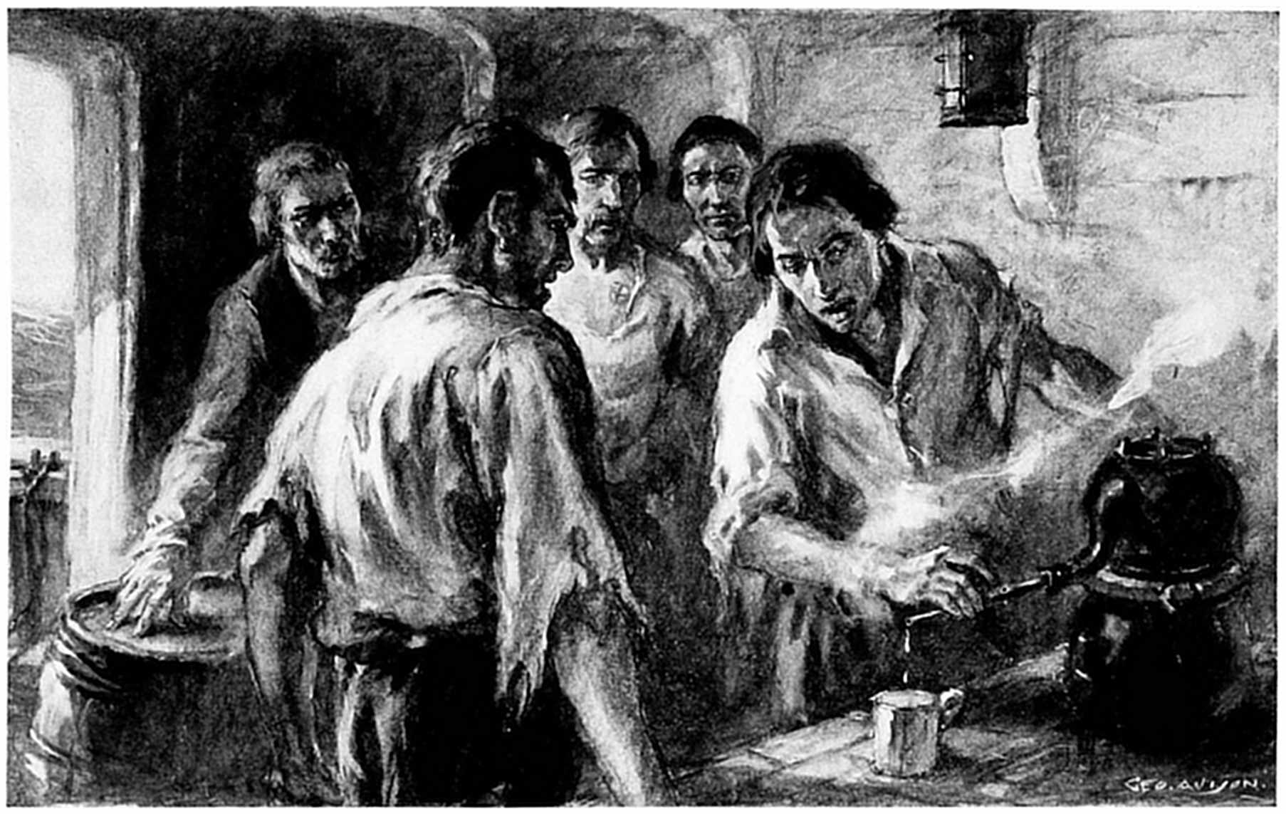 At length he took an iron pot from the galley, turned the tea-kettle upside down on it, and found that the rims failed to fit together. Undismayed,15 the skipper whittled a wooden collar with a seaman’s sheath-knife, and so joined the pot and the kettle. With strips of cloth and pitch scraped from the deck-beams, he was able to make a tight union where his round wooden frame set into the flaring rim of the pot. Then he knocked off the stock of the pistol and had the long barrel to use for a tube. This he rammed into the nozzle of the tea-kettle, and calked them as well as he could. The result was a crude apparatus for distilling seawater, when placed upon the bricked oven of the galley.