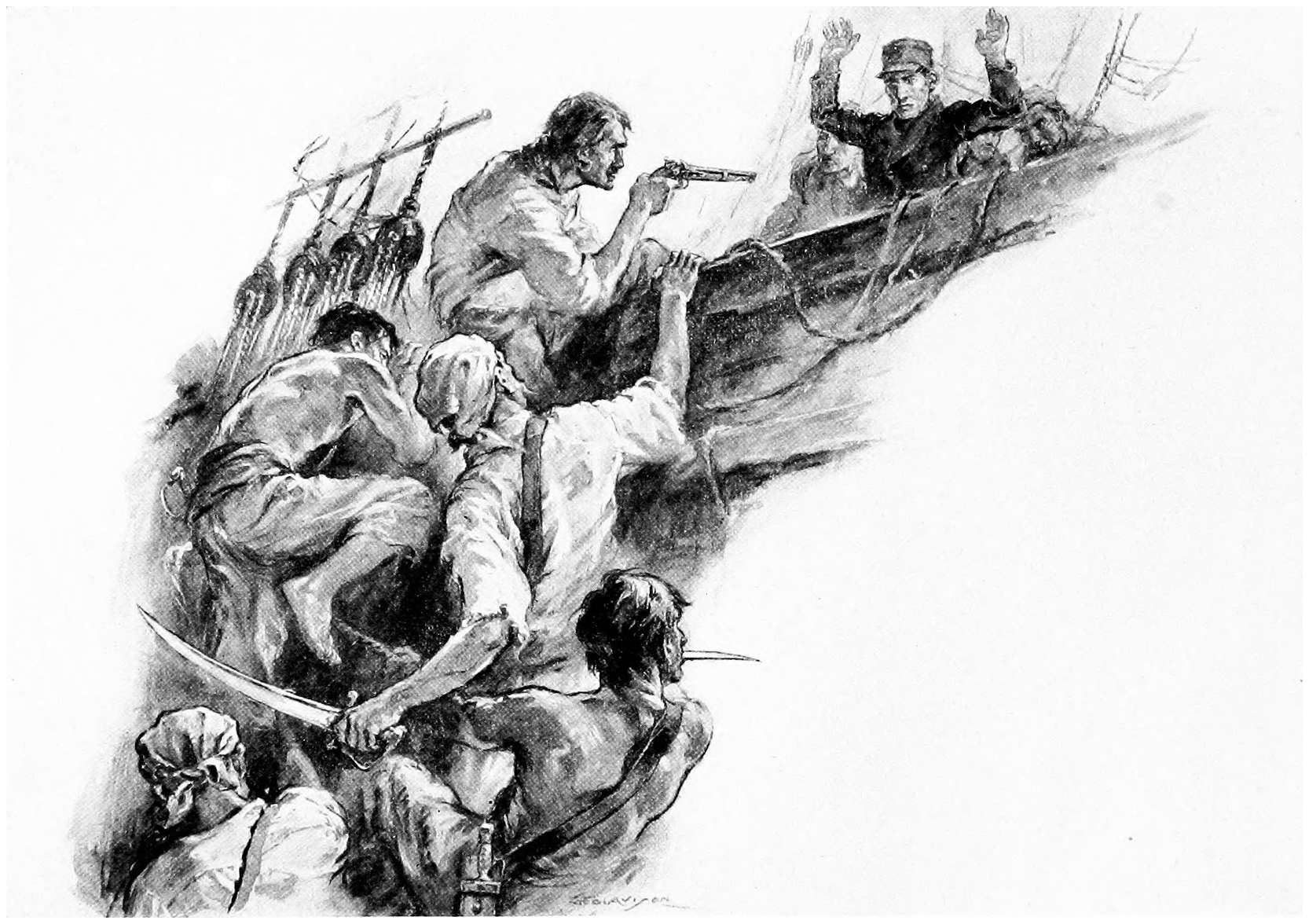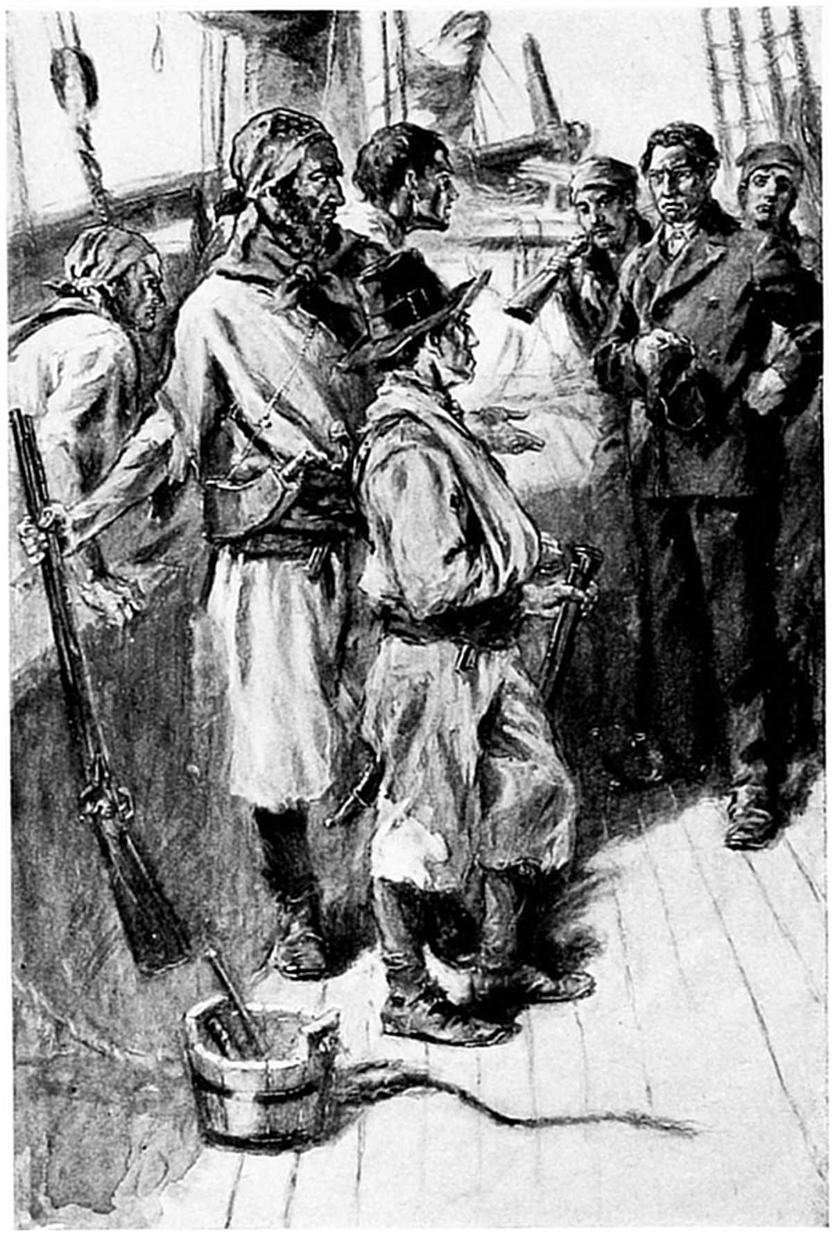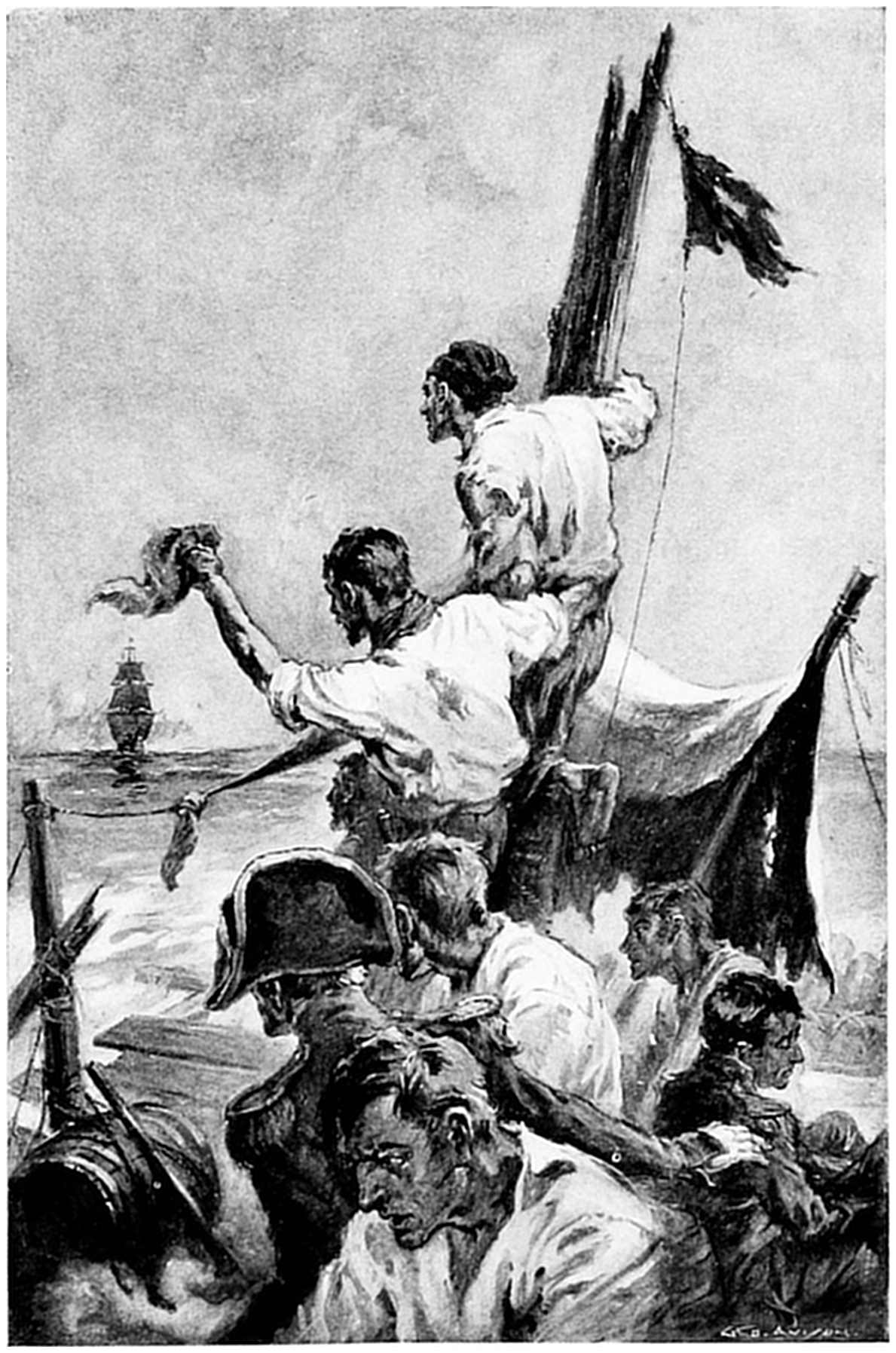 Captain Cazneau seems to have been a sailor of extraordinary resource and resolution. His was the unbreakable will to live and to endure which kept the vital spark flickering in his shipmates. Whenever there was strength enough among them, they groped in the water in the hold and cabin in the desperate hope of finding something to serve their needs. In this manner they salvaged an iron tea-kettle and one of the captain’s flint-lock pistols. Instead of flinging them away, he sat down to cogitate, a gaunt, famished wraith of a man who had kept his wits and knew what to do with them.