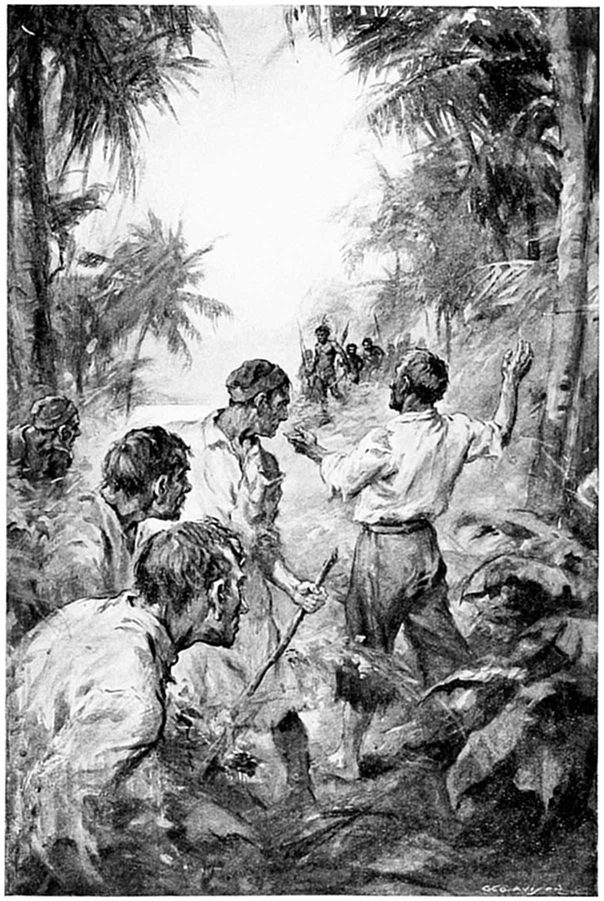 Two canoes came paddling into the cove next day, and Captain Wilson went down to meet the islanders. Luckily, he had with him a sailor named Tom Rose who could talk one or two Malay dialects, and he managed to struggle along as an interpreter for the reason that a native in one of the canoes could also speak the Malay tongue.