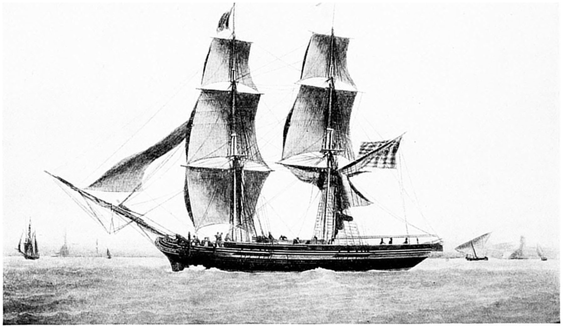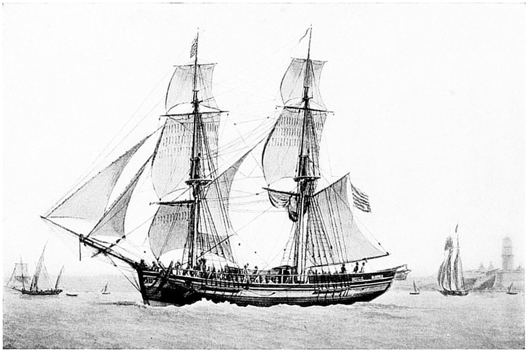 Your fancy may be able to picture the brig Polly as she steered down Boston harbor in December, 1811, bound out to Santa Cruz with lumber and salted provisions for the slaves of the sugar plantations. She was only a hundred and thirty tons5 burden and perhaps eighty feet long. Rather clumsy to look at and roughly built was the Polly as compared with the larger ships that brought home the China tea and silks to the warehouses of Salem. Such a vessel was a community venture. The blacksmith, the rigger, and the calker took their pay in shares, or “pieces.” They became part owners, as did likewise the merchant who supplied stores and material; and when the brig was afloat, the master, the mate, and even the seamen were allowed cargo space for commodities that they might buy and sell to their own advantage. A voyage directly concerned a whole neighborhood.