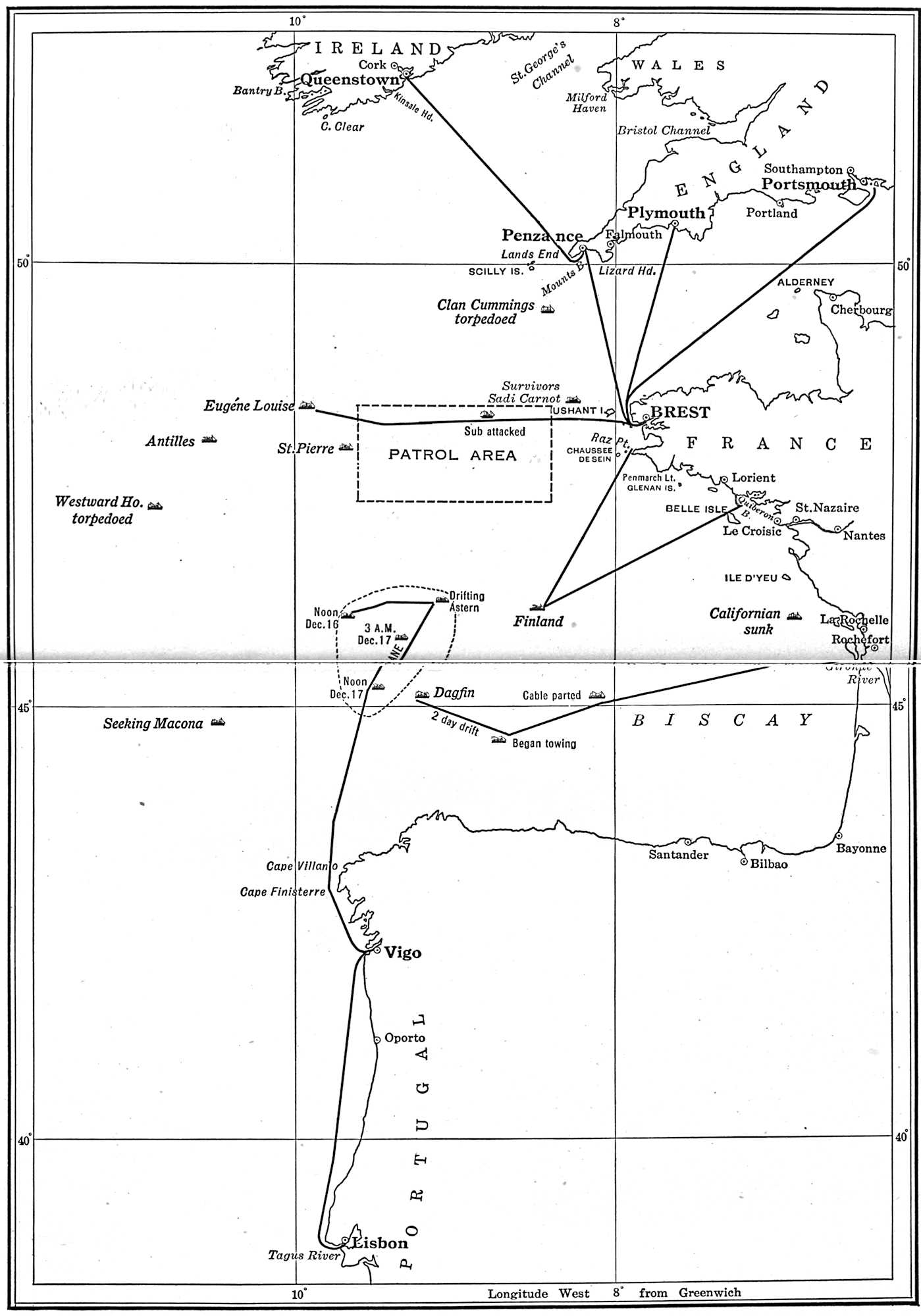 MAP SHOWING THE CORSAIR’S WANDERINGS IN THE WAR ZONE