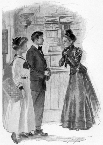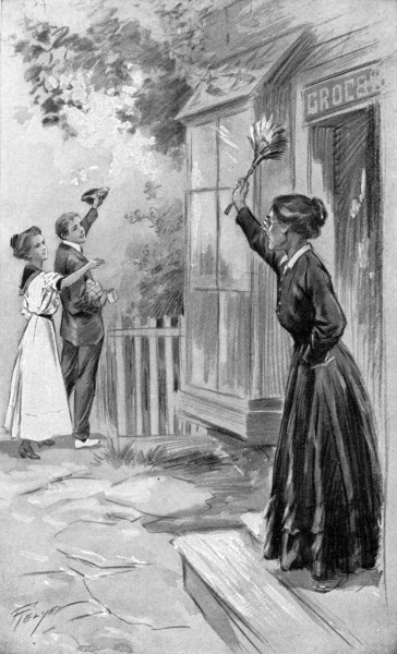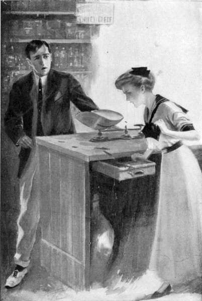 “Good-by, sir. Good-by, Miss. I do hope you’ll come up this way again, and—and—” The little woman broke off vaguely and swept her gaze quickly about the store. Then, “Just you wait a bit, please, Miss,” she exclaimed. She trotted back to the ribbon-case, casting a backward glance at Harry’s face, and fumbled agitatedly about there for a moment. Then she came back with a roll of light-blue ribbon which she put in Harry’s hand.