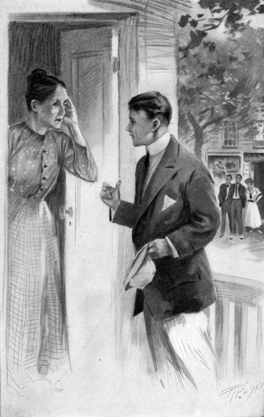 The gift was a pale pink mustache-cup, decorated with green leaves and purple flowers, and bearing the inscription in funny gilt lettering, “Friendship’s Token.” Chub glanced at Harry, whose eyes were dancing merrily and yet looked a trifle misty, and then at Mrs. Peel. Apparently,[404] however, that lady was quite unaware of the irony of presenting Chub with a mustache-cup, and Chub restrained a smile and thanked her quite gravely and earnestly. When they reached the corner with their gifts and purchases, they turned and looked back. The little woman was in the doorway, smiling and waving her feather duster. They waved back to her and went on. Harry was silent until they were taking the hill. Then: