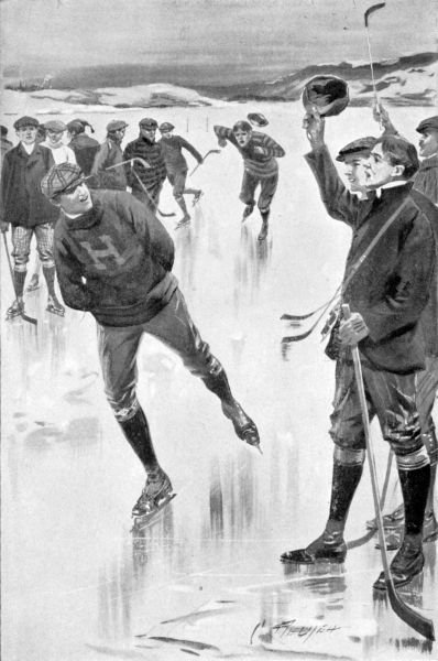 The brakeman winked solemnly at the group of boys in the end seats, withdrew his head, slammed the door and crossed the swaying platforms to make a similar announcement to the occupants of the car ahead. From the left side of the train passengers caught a glimpse of a broad expanse of meadow upon which tiny flecks of red flared dully in the winter sunshine; of a distant grand stand, bleak and desolate, against whose northern shoulder a drift of snow snuggled as though seeking protection from its enemy the sun; of two pairs of goal-posts gravely watching each other from opposite ends of a long field; of a bit of country road, a slowly rising hill, a little army of leafless elms, and, last of all, crowning a promontory below which the frozen Hudson sparkled, a group of old red brick buildings, elbowing each other with friendly rivalry in an endeavor to gain the post of honor and to be first seen of[2] the outside world that traveled by train. That was Hillton Academy.