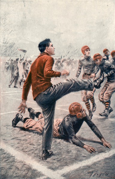 Back came the ball to his hands. He turned it end up, canted it a trifle, settled it to earth. Kendall stepped forward. He had forgotten that the enemy, desperate and determined, were waiting to throw themselves upon him. He only saw the ball and, dimly, the whitewashed posts straight ahead. The lines broke. Broadwood came rushing through. Canvas rasped against canvas. Inarticulate cries filled the air. Kendall’s toe met the ball squarely below the lacing. Somebody plunged against him and he went over backward.