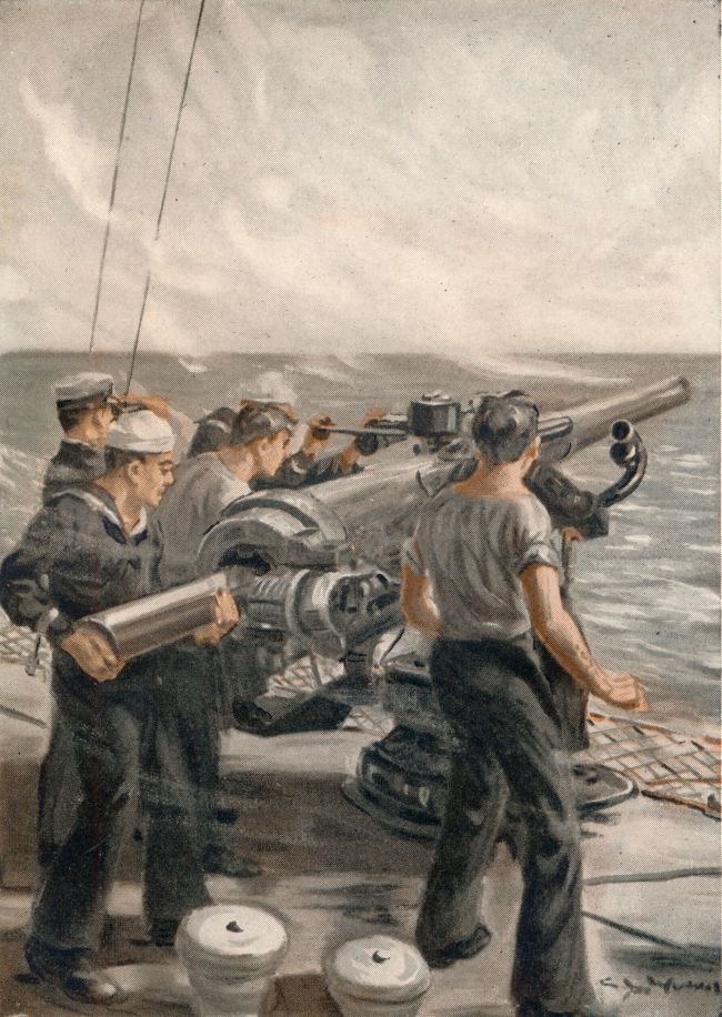 Again the gun spat and an instant of breathless anxiety followed. Then a cheer, shrill and wild, went up from the Number Four crew. The submarine’s conning tower, low-set between slanting wave-breakers, crumpled up as the five-inch shell struck it fairly!