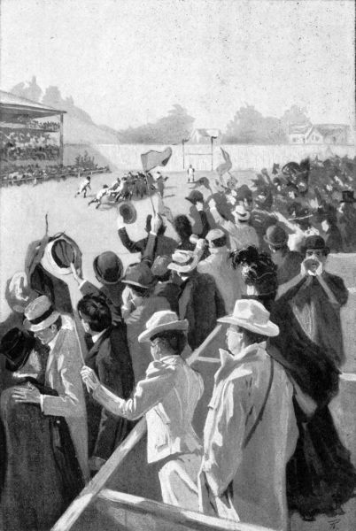 From the grand stand every foot of the far-stretching course was plainly in sight, and now the first men looked like white specks as they took the turn, scrambled over the second hedge jump, and headed toward home. Many of the watchers deserted the finish line and clustered about the water jump, loudly expressing the hope that some one would “take a bath.” They climbed on to the fences that led up to the obstacle and waited impatiently for the runners to appear. Suddenly two white-clad figures were for a moment seen sharply against the gray of the hills as they took the railroad track in a bound; then they were climbing the fence and speeding toward the watchers. Simultaneously three others came into view, followed a moment later by a fourth.