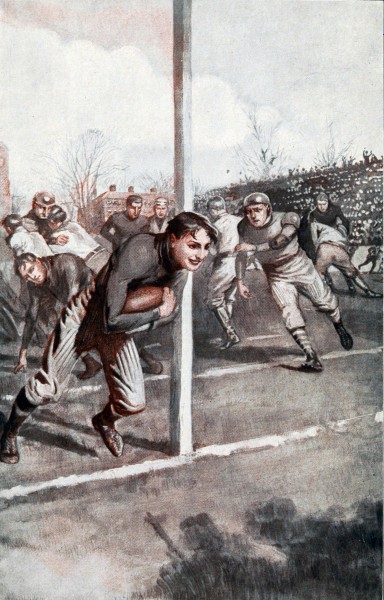 “Forward pass!” cried Broadwood again, and her whole team followed to where, ten yards back of the line, Yardley was bunched as though to receive the pass. No one but the Broadwood quarter saw Dan steal through outside of tackle unmolested, and he saw it too late. Kapenhysen had stopped in his flight to the right and had passed the ball, straight and swift to Capes, fifteen yards away across the field. Capes took a step or two, stopped and sped the ball forward in a low curve to Dan’s waiting hands. Back raced the Broadwood players, but too late. Dan was almost on the five-yard-line when the ball settled into his arms. With a quick turn he plunged to the right, eluded the oncoming Broadwood half, tore free from the quarter and went staggering around the goal-post for a touchdown and victory.