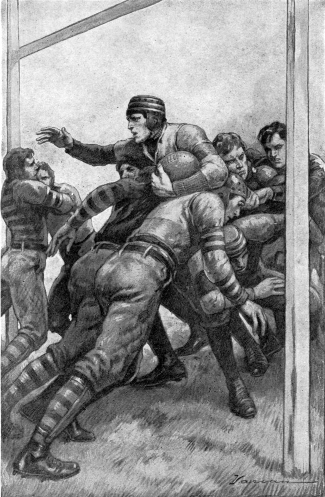 Straight at center he had gone. There was no hole awaiting him, but the assault was so sudden, so unexpected that the enemy gave and he went smashing through. Then the Broadwood backs threw themselves to the rescue and the line held. For a moment the advance paused and the referee’s whistle went to his lips, and in that moment Roover charged in behind the struggling wedge, the mass moved forward again, a foot, a yard, faster, and yet faster! And then, suddenly the defense fell to pieces and Heming, his head and shoulders well above the sea of writhing bodies, shot forward and down and was gone from sight. And from the Yardley stands arose a straining shout that reached even Toby, buried deep in the wake of the victory!