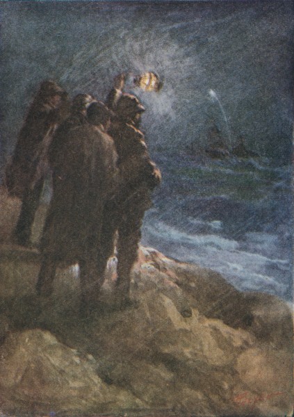 The Crystal Spring began to roll as the wind increased, behaving in a most frolicsome, undignified manner. Half-way between the beacon and the lighthouse point the rain began in earnest, slanting out of the west and pelting at Jack’s back vindictively. There was quite a sea by now, although the rain flattened the surface somewhat and the squall blew the tops of the waves into spume. Jack, finding himself in for it, began to whistle tunelessly, leaning[19] against the tiller and peering out from under the brim of his sou’easter. It was too thick to see very far ahead and it behooved him to be watchful, since a fisherman might be beating his way in around Popple Head. But he sighted nothing and the lighthouse was abeam and he brought the sloop’s blunt nose around. In another minute he would be in the lee of the shore and well out of some nasty weather. The thunder still crashed at intervals and now and then the dun clouds were rent asunder by the livid flashes of lightning. The lighthouse dropped astern and the Crystal Spring, with a final impatient roll, settled back on an evener keel. And at that moment, following a crash of thunder, Jack heard a faint hail.