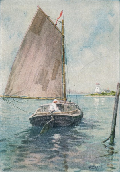 With his feet in the shallow cockpit sat the skipper and crew of the Crystal Spring, one arm draped over the long tiller. The skipper and crew was sixteen years of age, had a good-looking weather-tanned face, a sturdy body and was named John Herrick—and called Jack. He had a pair of nice brown eyes, a straight nose well freckled, a fairly wide mouth and a square and rather aggressive chin. Just at present his mouth was puckered up, for Jack was whistling—I almost said a tune. Let’s simply remark that he was whistling and let it go at that, for the fact is that Jack could no more whistle a tune than he could sing one; and if you ever heard him try to sing you’d understand. As he whistled, his gaze roamed from the sail to the shore and thence out to sea. Seaward there was little to look at—only a smudge of smoke like a narrow cloud trailing above the horizon. Shoreward was the end of the Neck and the squat white lighthouse agleam in the sunlight of a late June morning. Behind the lighthouse was the keeper’s little cottage with its weathered roof[3] and green blinds, and its tiny garden of sweet peas and nasturtiums, making a spot of bright color against the yellow-green of beach-grass and the gray of boulders. The tiller moved a little, the sail flapped for an instant and then filled again and the sloop slowly turned to pass Popple Head and run along close to the granite breakwater, seeking the harbor entrance.