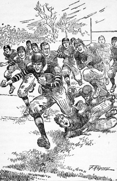 Dick was seventeen, the right height for his age, slender in a well-muscled, athletic way, and undeniably good-looking. His features were regular, with a rather high forehead and a well-cut straight nose. His eyes were brown, a warm brown that held a suggestion of red, and matched his hair. He had a fair complexion with plenty of healthy colour in the cheeks. It was one of the few sorrows of his life that he didn’t tan readily, that he had to go through a beastly period of sunburn and peeling skin before he could attain a decent shade of brown. He seemed unaware of his personal attractions, whether he was or not, and his smile, which was not the least of them, won where mere good looks failed. He always stood high in his class, for he learned easily. He[8] had a gift for music and could play any instrument at least passably after a surprisingly short acquaintance. He had a pleasant speaking voice and sang an excellent tenor on the school Glee Club. But it was perhaps in the less polite pursuits that he excelled. He had a record of ten and two-fifths for the hundred yards and had done the two-twenty under twenty-four. He was a fair high-jumper, usually certain of third place in the Dual Meet. In the water he was brother to a fish. He had played baseball one season not at all badly and could fill in at basket ball if needed. But, when all is said, Dick’s line was football. He had played two years on the High School Team at quarter-back. Last year he had been offered the captaincy without a dissenting voice and had refused it, announcing, what he had kept a secret until then, that he was leaving at the end of the school year, and nominating Sumner White. That Sumner was promptly elected was a further proof of Dick’s popularity, for ordinarily Sumner would scarcely have been thought of. As a football player Dick was really brilliant. He had a collection of fourteen epistles, which he was not averse to showing to close friends, from as many preparatory schools and smaller colleges urging him to consider their advantages to a person of his[9] scholastic attainments. Parkinson School, however, was not represented in that collection, perhaps because Parkinson was too far away for his fame to have reached it. Dick had chosen Parkinson for the completion of his preparation for college only because his brother Stuart had graduated from there some five years before. Stuart had talked of Parkinson so much that Dick felt that he knew the school and that he was certain to like it. He might have entered two years ago, but had chosen to remain at the high school until he could go to the preparatory school with a fair chance of making the football team. He believed now that the time had arrived. Although he had belittled his chances in conversation with Sumner White, secretly Dick entertained few doubts of his ability to make the Parkinson team.