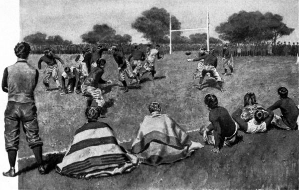 Jimpson sat on the ground, and watched with breathless interest two charging, tattered, writhing lines of men. Jimpson felt a good deal like an outcast, and looked like a North American Indian. Only legs and face were visible; the rest of Jimpson was enveloped in a big gray blanket with barbaric red borders. Some two dozen counterparts of Jimpson sat or lay near by, stretching along the side-line in front of the Harvard section of the grand stand. Behind them a thousand enthusiastic mortals were shouting pæans to the goddess of victory, and, unless that lady was deaf, she must have heard the pæans, however little she approved of them. The most popular one was sung to a well-known tune: