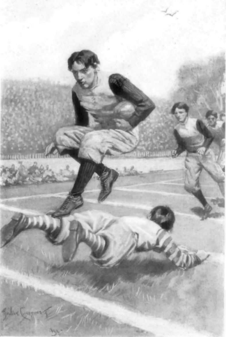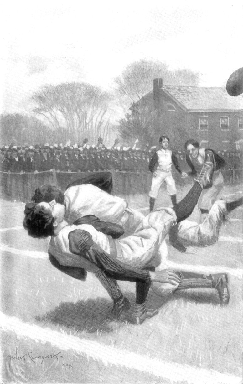 One--two--three strides he made. The goal line writhed before his dizzy sight. Relentlessly the clutching grasp fastened tighter and tighter about him like steel bands, and settled lower and lower until his legs were clasped and he could move no farther! Despairingly he thrust the ball out at arms' length and tried to throw himself forward; the trampled turf rose to meet him....
