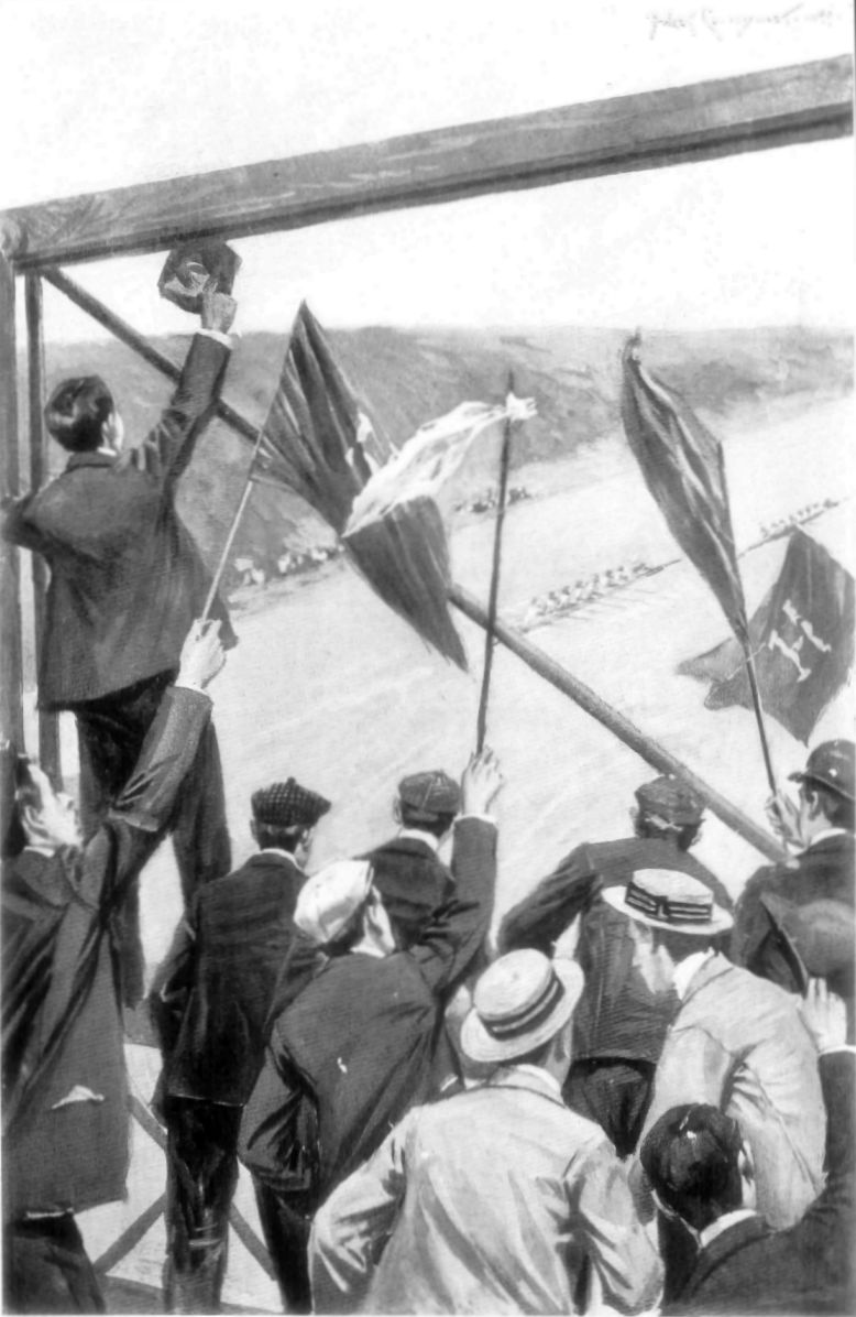 And what a burst of sound greeted their reappearance! The west stand shook from end to end. Crimson banners broke out on the breeze, every one was on his feet, hats waved, umbrellas clashed, canes swirled. A youth in a plaid ulster went purple in the face at the small end of a five-foot horn; and for all the sound it seemed to make it might as well have been a penny whistle. The ushers waved their arms, but to no purpose, since the seats heeded them not at all, but shouted as their hearts dictated and as their throats and lungs allowed.