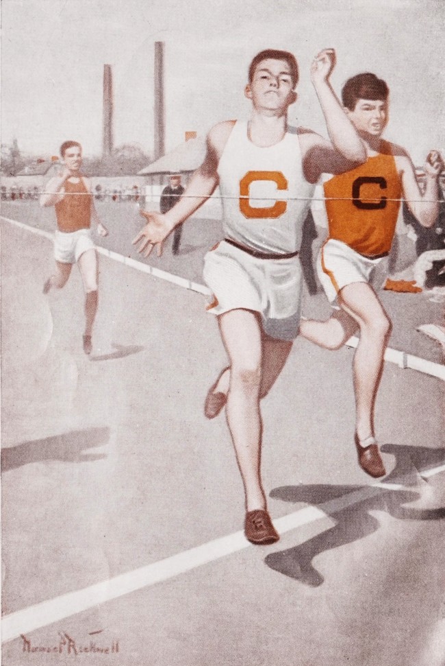 Some over-anxious Springdale sprinter leaped away and it had all to be gone through with again. But at last the pistol sounded and Perry, without knowing just how he had got there, found himself well down the track, his legs flying, his arms pumping up and forward and down and back, his lungs working like a pair of bellows and the cries and exhortations of the spectators in his ears. A youth with blue stripes down the seams of his fluttering trunks was a good yard in the lead and Perry, with three others, next. Someone, and Perry silently hoped it wasn’t Soper, was no longer in sight. Perry put the last gasp of breath and last ounce of strength into the final twenty yards in a desperate effort to overtake that Springdale runner, but it wasn’t until they were almost at the tape that he knew he had gone ahead, and then, as he threw his arms up, a third white-clad figure flashed past!