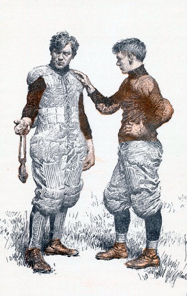 “Oh, well,” said Harry, smiling at his friend’s woe-begone countenance, “perhaps it won’t be as bad as that. And if he’s played football at all we ought to be glad to get him.[4] We haven’t so much new material in sight this fall that we can afford to be particular. I really think, though, you ought to have gone to the station to meet him, Bert.”