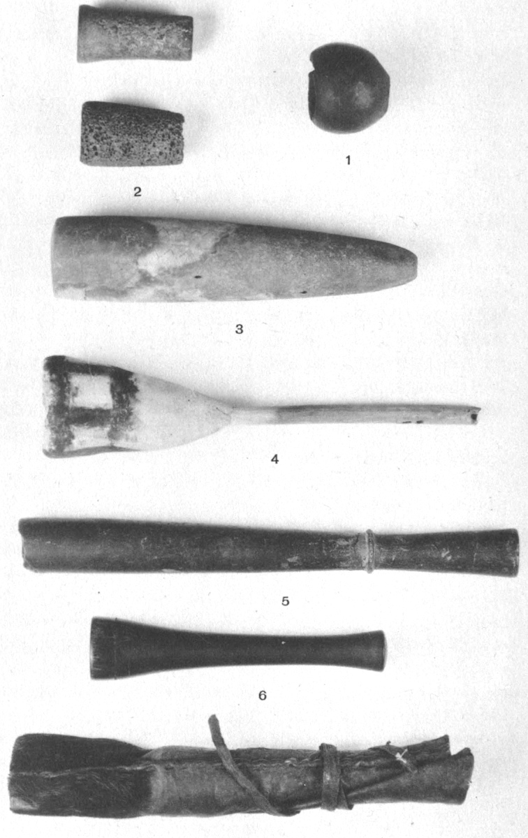 An Indian warrior was rarely without his pipe and tobacco, and special tobacco-bags were used by all the tribes east of the Rocky Mountains. In early times, these bags were usually made from the skins of small animals taken off whole. The Eastern Woodland tribes used a rather small bag which was tied to the belt. The Plains tribes used a larger bag, often made from a fawn skin, in which they carried both the pipe and tobacco. In historic times the northern Plains Indians have used long, flat rectangular bags decorated with beads or porcupine quills, but this type apparently is not an ancient one (Pl. V, No. 10). Several of the Plains tribes also had special boards on which the tobacco was cut up and elaborate pipe tampers (Pl. V, No. 9). These accessories were used mainly in ceremonial smoking. In Pawnee ceremonies the pipe was always tamped with an arrow captured from the enemy. It was forbidden to pack it with the fingers, as the gods might think that the man who did so offered himself with the tobacco and take his life. The tribes of the Northwest Coast crushed their tobacco23 in mortars. These were usually made from whale vertebrae, and were often elaborately carved.