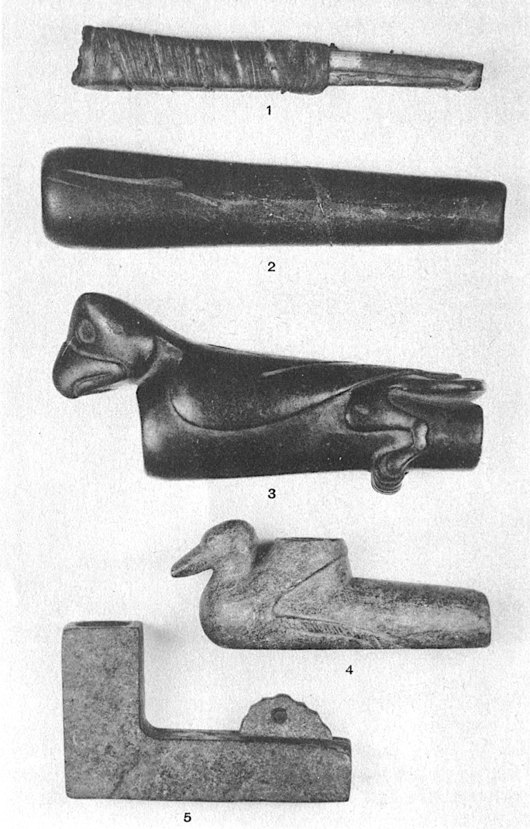 A number of straight pipes of stone and clay have been found in the eastern United States, but there seems to be no record of their use by the historic tribes. The examples shown (Pl. III, Nos. 2–3) are from Johnson County, Illinois. They are made from close-grained greenish brown steatite, a material soft enough to be easily worked with flint tools, but capable of taking a fine polish. The large size and excellent finish of these pipes indicates that they were intended for ceremonial rather than personal use. The bird pipe is eight and a quarter inches long, with an13 internal bowl diameter of one and a quarter inches, and is an unusually good example of aboriginal sculpture. The eye sockets are roughly finished, and were probably inlaid with some other material.