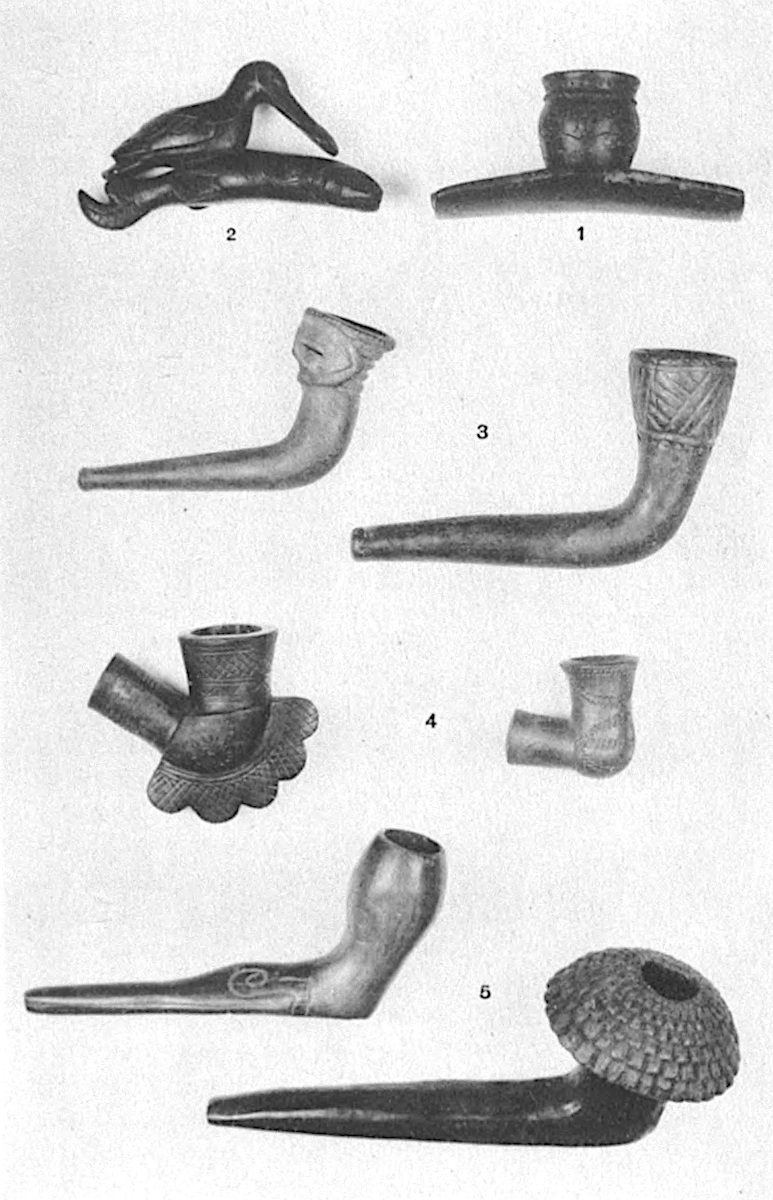 1. MONITOR PIPE, HOPEWELL MOUNDS, OHIO. 2. BIRD AND FISH PIPE, HOPEWELL MOUNDS, OHIO. 3. IROQUOIS CLAY PIPE. 4. CATAWBA CLAY PIPES (MODERN). 5. MEXICAN CLAY PIPES (TOLTEC?).