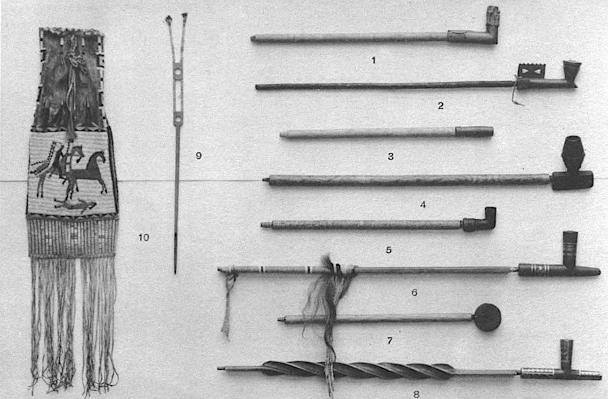 1–2. PAWNEE SACRED PIPES. 3. CHEYENNE SUN-DANCE PIPE. 4. BLACKFOOT PIPE. 5–7. CHEYENNE PIPES. 6–8. SIOUX PIPES. 9. PIPE TAMPER, SIOUX. 10. PIPE BAG, SIOUX.