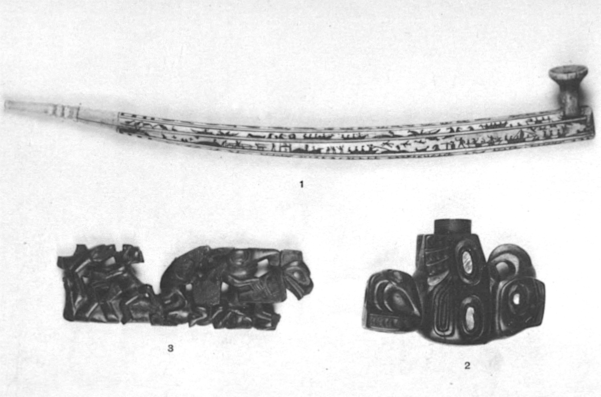 The Indians of the Northwest Coast chewed tobacco in ancient times, but did not smoke it. The more northern tribes may have adopted smoking from Asia by way of the Eskimo, but their pipes show little resemblance to the Asiatic forms, and they probably learned the practice from white visitors. The natives of this region are expert carvers, and nearly all their pipes are decorated with figures of men or totemic animals. Wood is the favorite material (Pl. VI, No. 2), but bone and antler are also used and some of the tribes make very elaborate pipes of black slate (Pl. VI, No. 3). The slate pipes are much sought after by collectors, and many of them seem to have been made for sale rather than use.