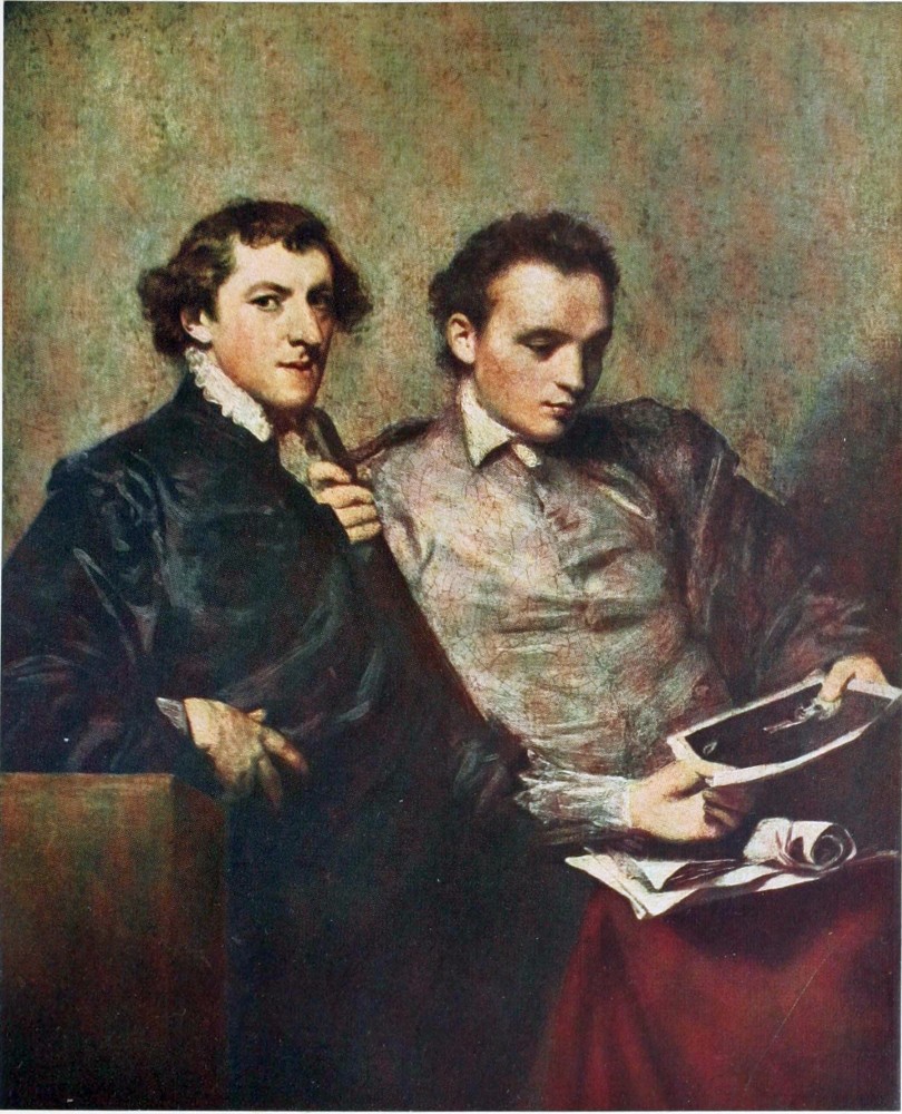 A slight gap in the story of Reynolds’s earlier days{22} is usefully filled by an essay entitled, “Observations on Sir Joshua Reynolds’s Method of Colouring,” and published by William Cotton in 1859. It had been written many years before by William Mason, the author of “Odes on Memory” and other poetical works. Mason was, besides, an amateur painter, and was always admitted to Sir Joshua’s painting room unless he had a sitter for a portrait. When not so occupied, he tells us, Reynolds was always retouching an old master, or had some beggar or poor child sitting to him, because he always chose to have nature before his eyes. Mason mentions the effect of the portrait of Keppel in attracting others to Reynolds, among the first being the young Lords Huntingdon and Stormont, who had just returned from the grand tour. As though determined to follow up the success of his Captain Keppel with as bold an effort in another direction, he challenged comparison with Vandyck by painting the two young lords at full length on the same canvas.