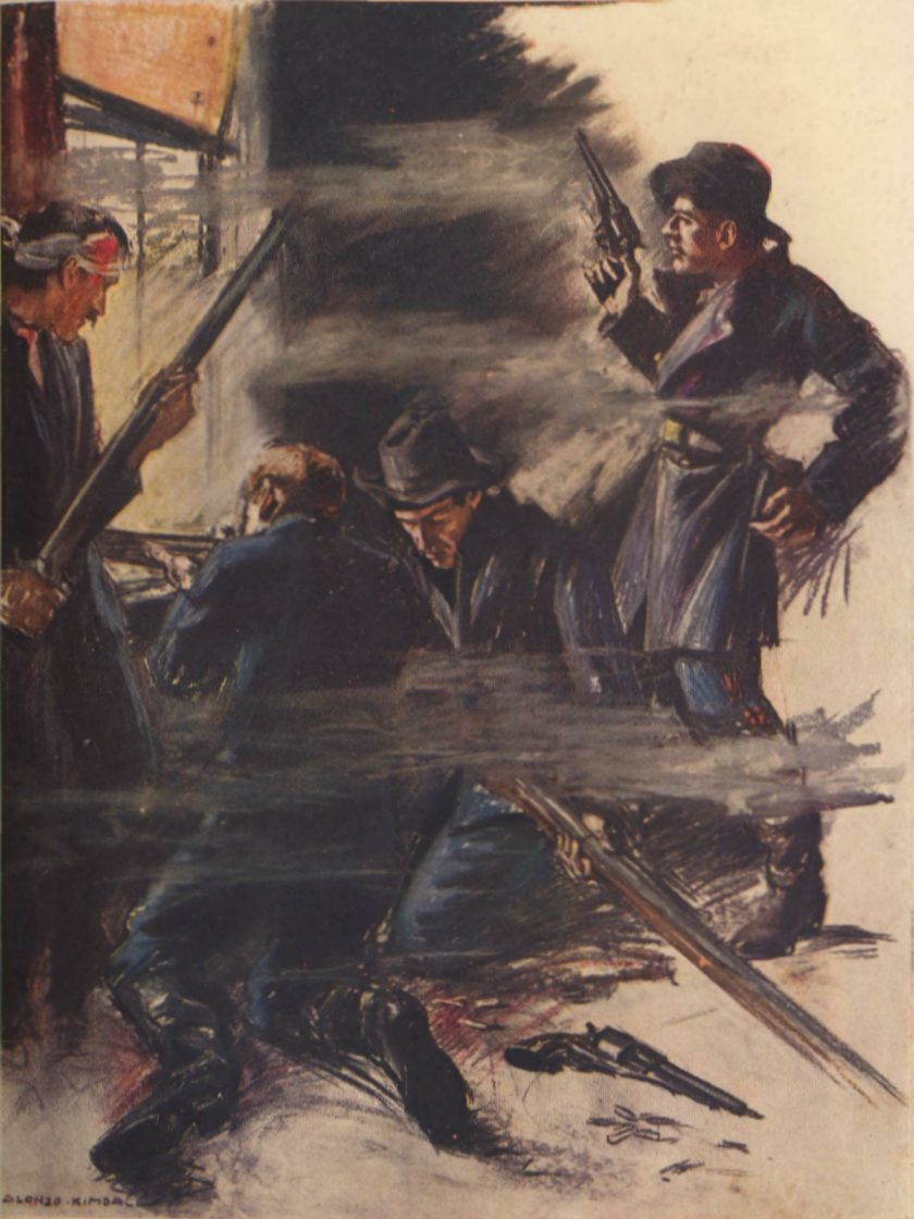 I stumbled over the rubbish, with but one thought driving me--the dining-room table, its white cloth, and the possibility of getting outside before those deadly guns could be discharged again. I knew the house was already in ruins, tottering, with huge gaping holes ripped in its sides; that dead men littered the floor; and the walls threatened to fall and bury us. Another round would complete the horror, would crush us into dust. I gripped the cloth, jerking it from the table, stumbling blindly toward the nearest glare of light. There was a pile of shattered furniture in the way, and I tore a path through, hurling the fragments to left and right. I smelt the fumes of powder, the odor of plaster, and heard groans and cries. The sharp barking of carbines echoed to me, and a wild yell rose without. There were others living in the room; I was aware of their voices, of the movement of forms. Yet all was chaos, bewildering confusion. I had but the single thought, could conceive only the one thing. I was outside, gripping the white cloth, clinging with one hand to the shattered casing. Some one called, but the words died out in the roar of musketry. The flame of carbines seemed in my very face, the crack of revolvers at my ears. Then a hand jerked me back head first into the debris. I staggered to my knees, only to hear Mahoney shout,