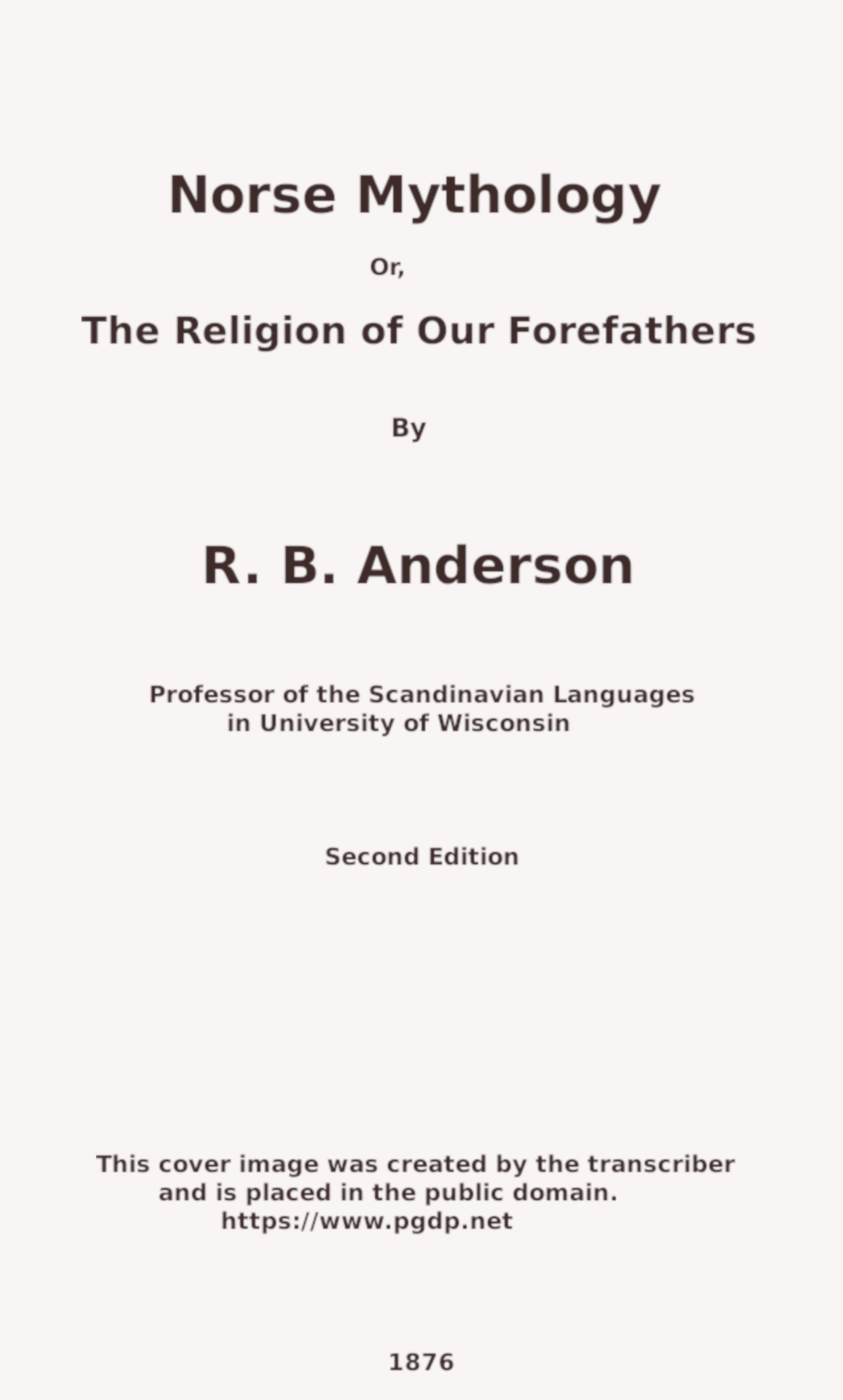 What we claim for this work is, that it is the first complete and systematic presentation of the Norse mythology in the English language; and this we think is a sufficient reason for our asking a humble place upon your book-shelves. And, while we make this claim, we fully appreciate the value of the many excellent treatises and translations that have appeared on this subject in England. We do not undervalue the labors of Dasent, Thorpe, Pigott, Carlyle, etc., but none of these give a comprehensive 9account of all the deities and the myths in full. There is, indeed, no work outside of Scandinavia that covers the whole ground. So far as America is concerned, the only work on Norse mythology that has hitherto been published in this country is Barclay Pennock’s translation of the Norse Professor Rudolph Keyser’s Religion of the Northmen. This is indeed an excellent and scholarly work, and a valuable contribution to knowledge; but, instead of presenting the mythology of the Norsemen, it interprets it; and Professor Keyser is yet one of the most eminent authorities in the exposition of the Asa doctrine. Pennock’s translation of Keyser is a book of three hundred and forty-six pages, and of these only sixteen are devoted to a synopsis of the mythology; and it is, as the reader may judge, nothing but a very brief synopsis. The remaining three hundred and thirty pages contain a history of Old Norse literature, an interpretation of the Odinic religion, and an exhibition of the manner of worship among the heathen Norsemen. In a word, Pennock’s book presupposes a knowledge of the subject; and for one who has this, we would recommend Pennock’s Keyser as the best work extant in English. We are indebted to it for many valuable paragraphs in this volume.