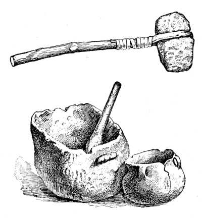 When first discovered by white men, Wisconsin Indians were using rude pottery of their own make. Their arrowheads and spearheads, axes, knives, and other tools and weapons were of copper obtained from Lake Superior mines, or of stone suitable for the purpose. They smoked tobacco in pipes wrought in curious shapes from a soft kind of stone found in[22] Minnesota, and ornaments and charms were also frequently made from this so-called "pipestone." Game they killed with arrows or sling-shots, and in war used these, as well as stone spears and hatchets and stone-weighted clubs. The bulk of their food they obtained by hunting, fishing, and cultivating the soil, although at times they were forced to resort to the usually plentiful supply of fruits, nuts, and edible roots. Indian corn was the principal crop. Beans were sown in the same hills, while sometimes between the rows were planted several varieties of pumpkins, water-melons, and sunflowers. Tobacco and sweet potatoes were grown by some tribes, but not in Wisconsin. In our State, wild rice (or oats) furnished a good substitute for corn, and was similarly cooked.