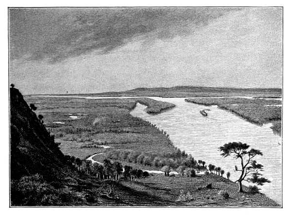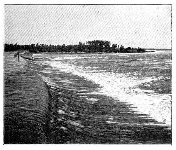 The broad valley of the Wisconsin presents a far different appearance from that of the peacefully flowing Upper Fox, with its outlying marshes of reeds, and its numerous lakes. The Wisconsin, or Meskousing, as Marquette writes it, is flanked by ranges of bold, heavily wooded bluffs, which are furrowed with romantic ravines, while the channel is, at low water, studded with islands and sand bars, and in times of flood spreads to a great width. Marquette himself describes it thus: "It is very broad, with a sandy bottom, forming many shallows, which render navigation very difficult. It is full of vine-clad islets. On the banks appear fertile lands diversified with wood, prairie, and hill. Here you find oaks, walnut, whitewood, and another kind of tree with branches armed with long thorns. We saw no small game or fish, but deer and moose in considerable numbers." About ninety miles below Portage, they thought that they discovered an iron mine.