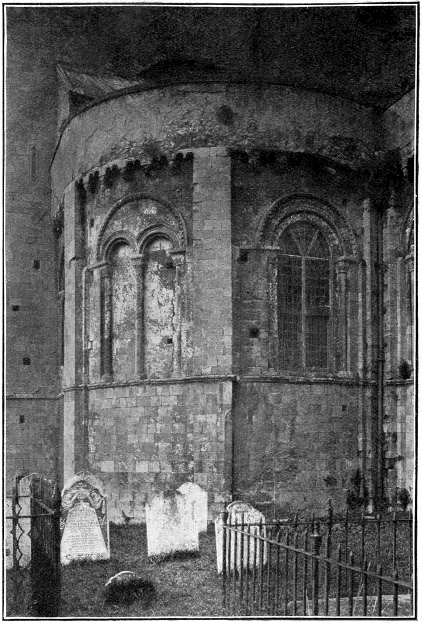 Passing round the south face of the transept, we come to the apsidal chapel attached to its eastern wall. (See illustration, p. 14.) The round-headed windows and the original parapet are worthy of notice. Quite recently a new high-pitched roof has been placed over this chantry. The illustration shows it before this change was made. Beyond this we come to the south aisle of the choir, with its three bays, each containing a round-headed window. The arrangement here is rather peculiar. The east wall of the choir, containing the two fourteenth-century windows side by side, rises just to the east of the second bay; the outer eastern wall of lower height at the extremity of the third bay is the east wall of the ambulatory or retro-choir. This was originally pierced by two arches, leading into the two parallel chapels, dedicated respectively to St. Mary and St. Ethelfleda, which were built in the fourteenth century, taking the place of two chapels, in Norman style, only about half their length measured from west to east. These two chapels were pulled down after the parish bought the church, to save the expense of keeping them in repair. The two arches leading into them were built up, but the geometrical east windows of the chapels were inserted in them, and now give light to the retro-choir. The ends of the choir aisles are apsidal within, but flat without. This arrangement leads to great thickness at the corners of the walls.