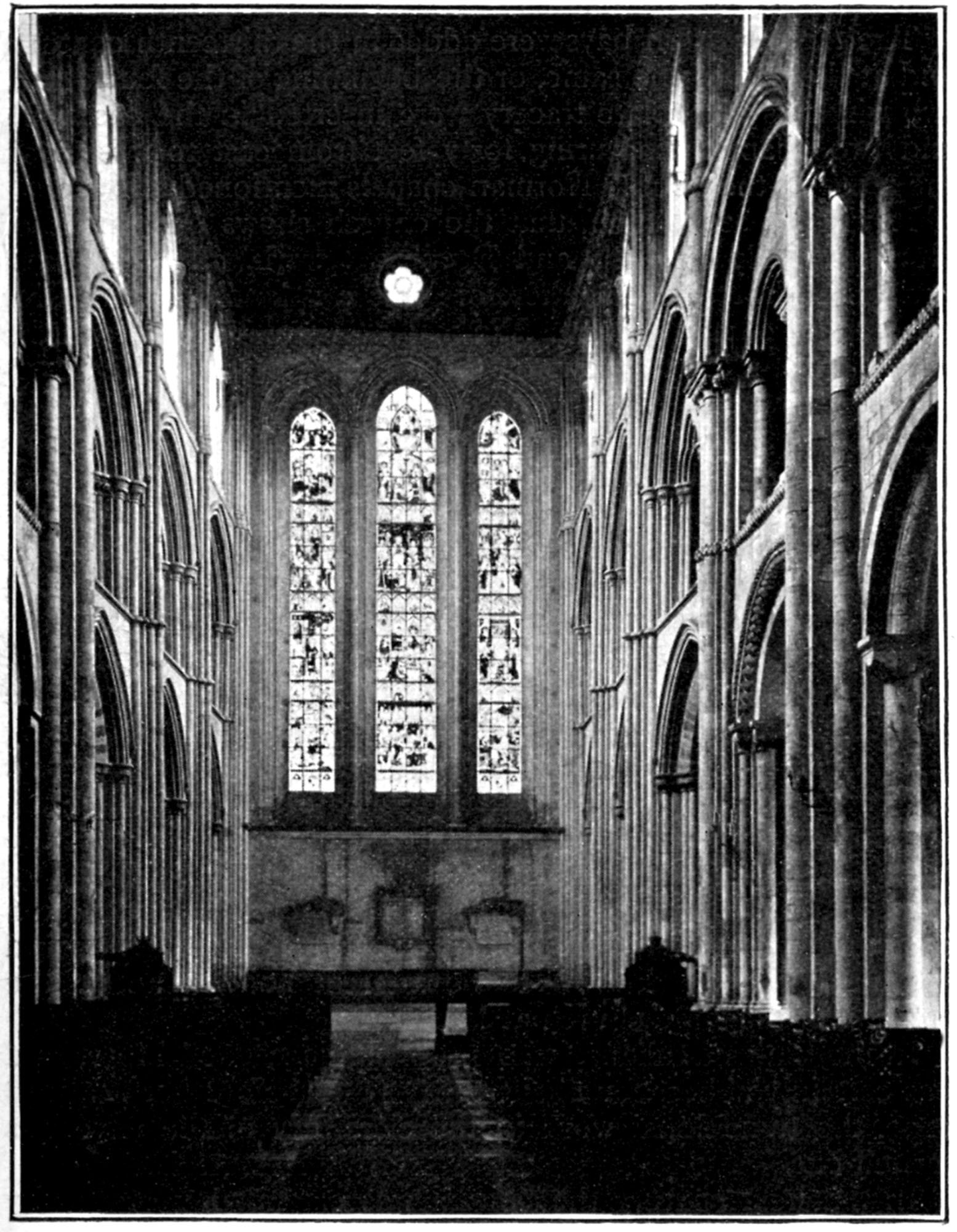 As we follow the winding lanes and streets that lead from the station to the church, we get our first view of it from the road that skirts its northern wall. On the left hand there is a [Pg 28] wall running from the north-east corner of the choir, which conceals indeed a few details of the lower part of the east end, but does not hide the two beautiful geometrical windows in the east wall of the choir, inserted within the semicircular headed mouldings of the original Norman windows. We may also see the square-faced termination of the north choir aisle projecting eastward of the wall that forms the east end of the choir. The next noteworthy object is an apsidal chapel or chantry running out from the east wall of the transept, its walls pierced by wide round headed windows. This is also a good point from which to study the clerestory as seen in choir and crossing. The same general arrangement prevails throughout the building, though here and there certain modifications will be noticed. Each clerestory bay on the north side has a window consisting of three arches, the central and wider one is glazed, the two others are blocked with stone. Three tiers (two in each) of round headed windows light the ends of the transepts.