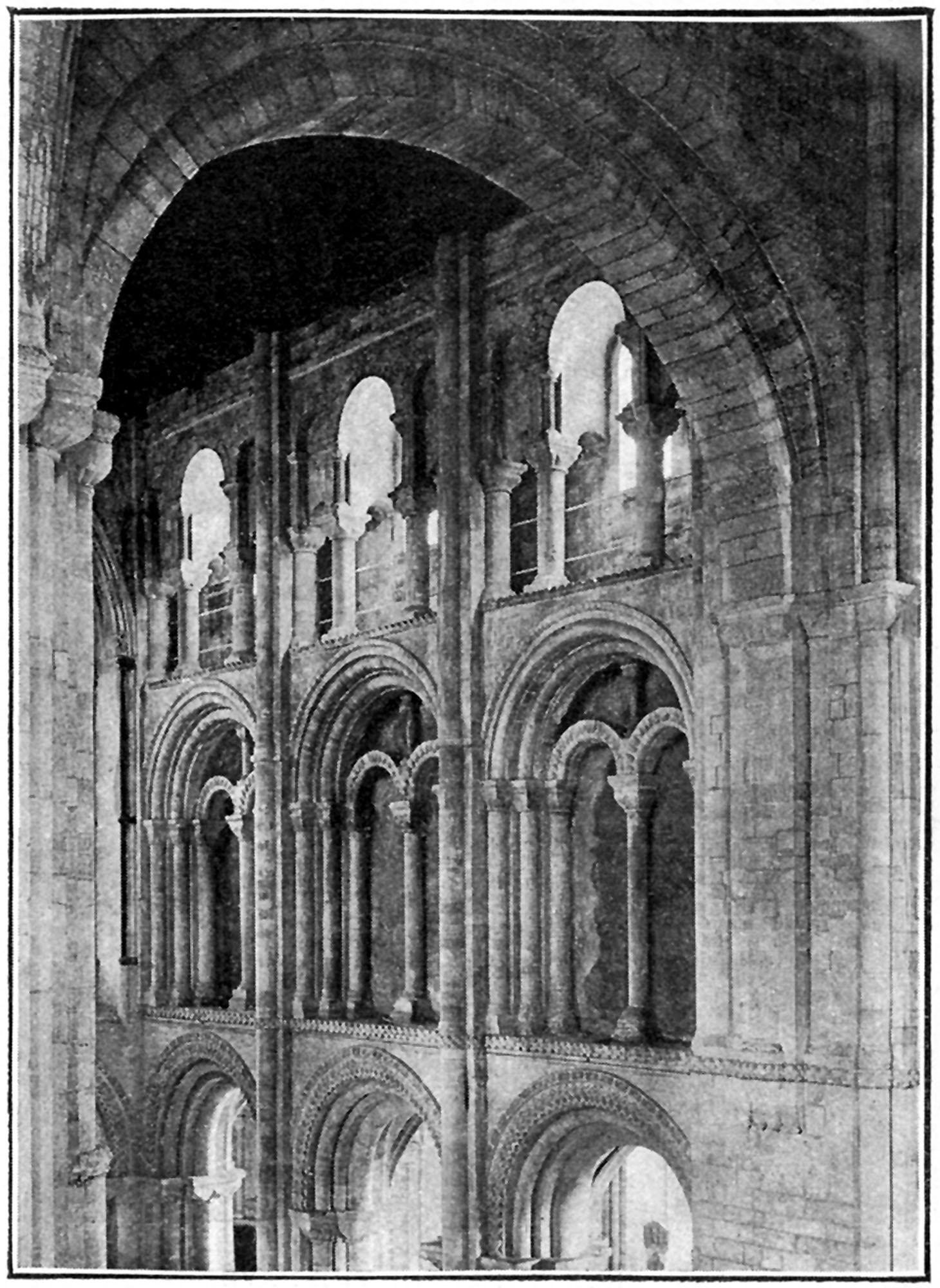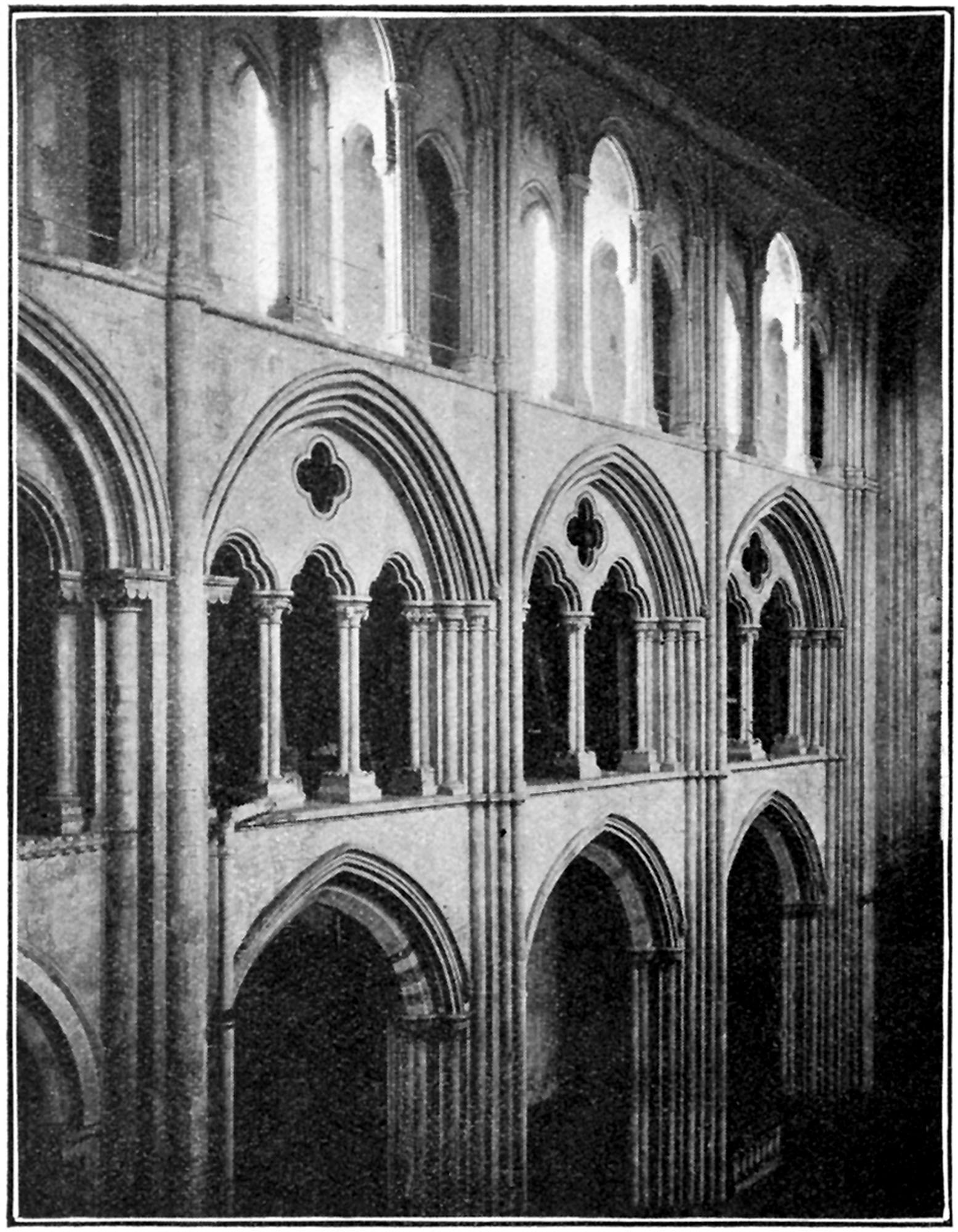 It may be well at the outset to point out that of the three horizontal divisions of the nave the main arcading occupies approximately three-sevenths of the total height of the wall, while the triforium and clerestory each occupy about two-sevenths.
