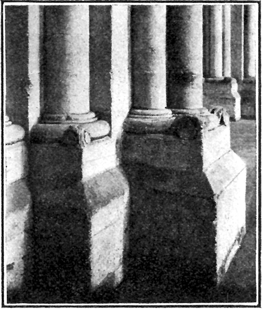 [Pg 51] The tomb, which is of imitation porphyry, takes the form of a sarcophagus, beneath an arch the soffit of which is adorned with red and white roses. Corinthian pillars of black marble support the structure.