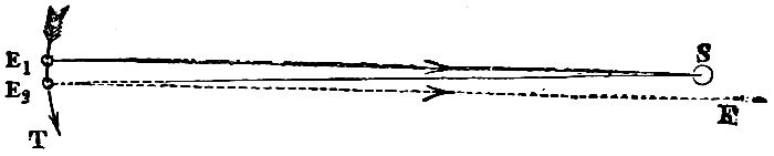 But unfortunately it is no easy matter to get the distance a b, fig. 48, determined in this simple manner. The distance 18,000 miles is known; but the difficulty is to determine what proportion the distance bears to the diameter of the sun S S´. All that we have heard about Halley's method and Delisle's method relates only to the contrivances devised by astronomers to get over this difficulty. It is manifest that the difficulty is very great.