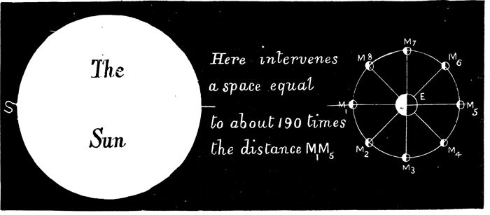 Now, finding the real size of an object like the sun, whose apparent size we can so easily measure, is the same thing as finding his distance. Any one can tell how many times its own diameter the sun is removed from us. Take a circular disc an inch in diameter,—a halfpenny, for instance—and see how far away it must be placed to exactly hide the sun. The distance will be found to be rather more than 107 inches, so that the sun, like the halfpenny which hides his face, must be rather more than 107 times his own diameter from us. But 107 times 846,000 miles amounts to 90,522,000 miles. This, therefore, if the imagined observations were correctly made, would be the sun's distance.
