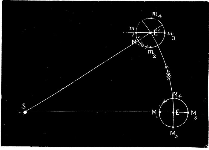 We have seen that the determination of the sun's distance by observing Venus on the sun's face would be a matter of perfect simplicity if we could be quite sure[283] that two observations were correctly made, and at exactly the same moment, by astronomers stationed one far to the north, the other far to the south.