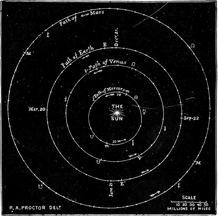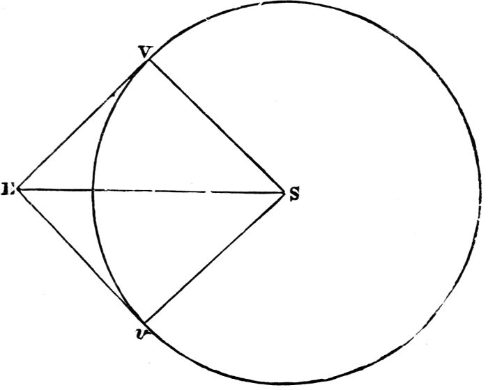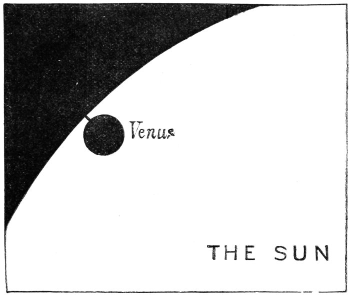 [17] There is, however, a much more perfect way of determining this proportion, by applying the law which Kepler found to connect the distances of the planets from the sun with the times in which they complete the circuits of their orbits. The law is that, if we take any two planets, and write down the numbers expressing their periods of circuit (say in days), and the numbers expressing their distances from the sun (say in miles) in the same order; then if we multiply each number of the first pair into itself, and each number of the second pair twice into itself, the four numbers thus obtained will be proportional; that is to say, as the first is to the second, so will the third be to the fourth. Now, as every one knows who has worked sums in the rule of three, when any three are given out of four proportionals, the fourth can always be found; but we know the periods of circuit both of the earth and Venus (365·2564 days and 224·7008 days respectively) very exactly indeed, because they have traversed their orbits so many times since they began to be observed by astronomers. We can call the earth's distance 100, and then applying the rule just stated, we get Venus' distance relatively to the earth's. The reader who cares to work out this little sum will find no difficulty whatever—if at least he is able to extract the cube roots of any number. The proportion runs thus:—