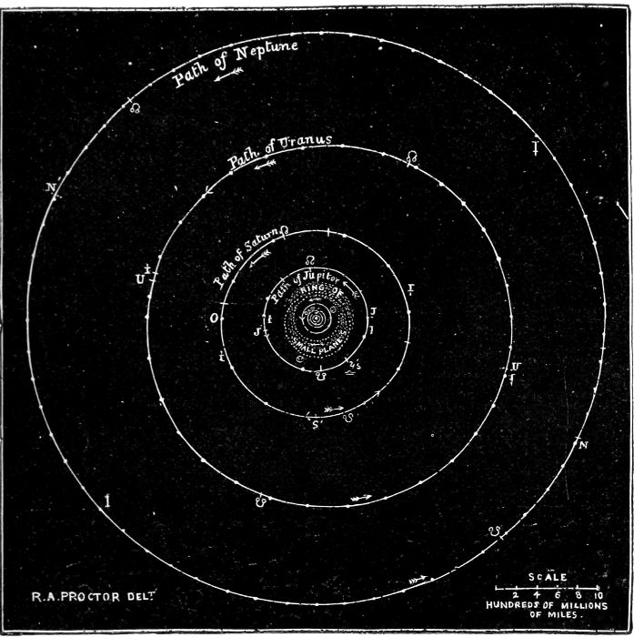 Fortunately, we know quite certainly that no such approach is taking place. It is known that the distance of the earth from the sun cannot change without a corresponding change in her period of revolution—that is, in the length of the year. The law connecting these two (indicated in the note, page 279) is such that, on the reduction of the distance by any moderate portion the[294] period would be reduced by a portion half as great again. For instance: if the distance of the earth from the sun were reduced by a thirtieth part (or about 3,000,000 miles) the length of the year would be reduced by a thirtieth and half a thirtieth—that, is, by a twentieth part, or by more than eighteen days. We know that no such change has taken place during the last century, or since the beginning of history. Nay, from the Chaldean estimate of the length of the year, which only exceeded ours by about two minutes, it is easily shown that the distance of the earth from the sun has not diminished 200 miles within the last 2,500 years. So that, assuming even that the earth is approaching the sun at this rate, or eight miles in a century, it would be 1,250,000 years before the distance would be diminished by 100,000 miles, which is the probable limit of error in the determination of the sun's distance.
