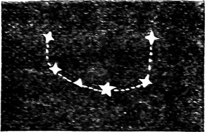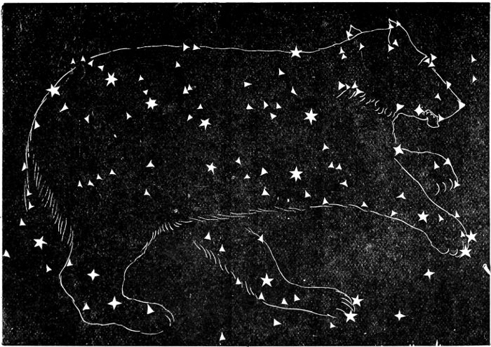 The Great Bear seems to have been a constellation of this sort. One can recognise the head of an animal like the bear or the hippopotamus, and also the feet of such a creature, but the proper disposal of the stars forming the animal's body is not so easy. This would not interfere, however, with the choice of the bear to represent the region of stars occupied by the constellation. Every one who has seen faces and figures in the fire—and who has not?—knows that one or two features will suffice to suggest a resemblance; either the imagination does all the rest, or else the idea is suggested that some other object partially conceals that portion of the imagined figure which is wanting.