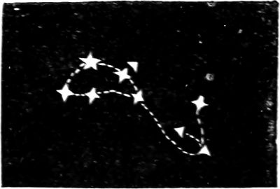 In order, however, to show that in some cases a skeleton figure can be formed by joining the stars of a constellation, and that the figure thus formed represents (of course in an utterly inartistic sort of way) the object associated with those stars, I will now take one or two instances in which such resemblance suggested itself to me without being specially sought for. I might add to the Crown, Dolphin, and Scorpion, the Chair of Cassiopeia, the figure of Orion, and the constellation of[263] the Cup; I omit these, however, not because they are unfit for my purpose, but because they so obviously illustrate my argument. No one, with the least power of imagination, can fail to see how a chair, a belted giant, and a cup, are pictured, as it were, in these constellations. I will take others where the resemblance is less obvious.